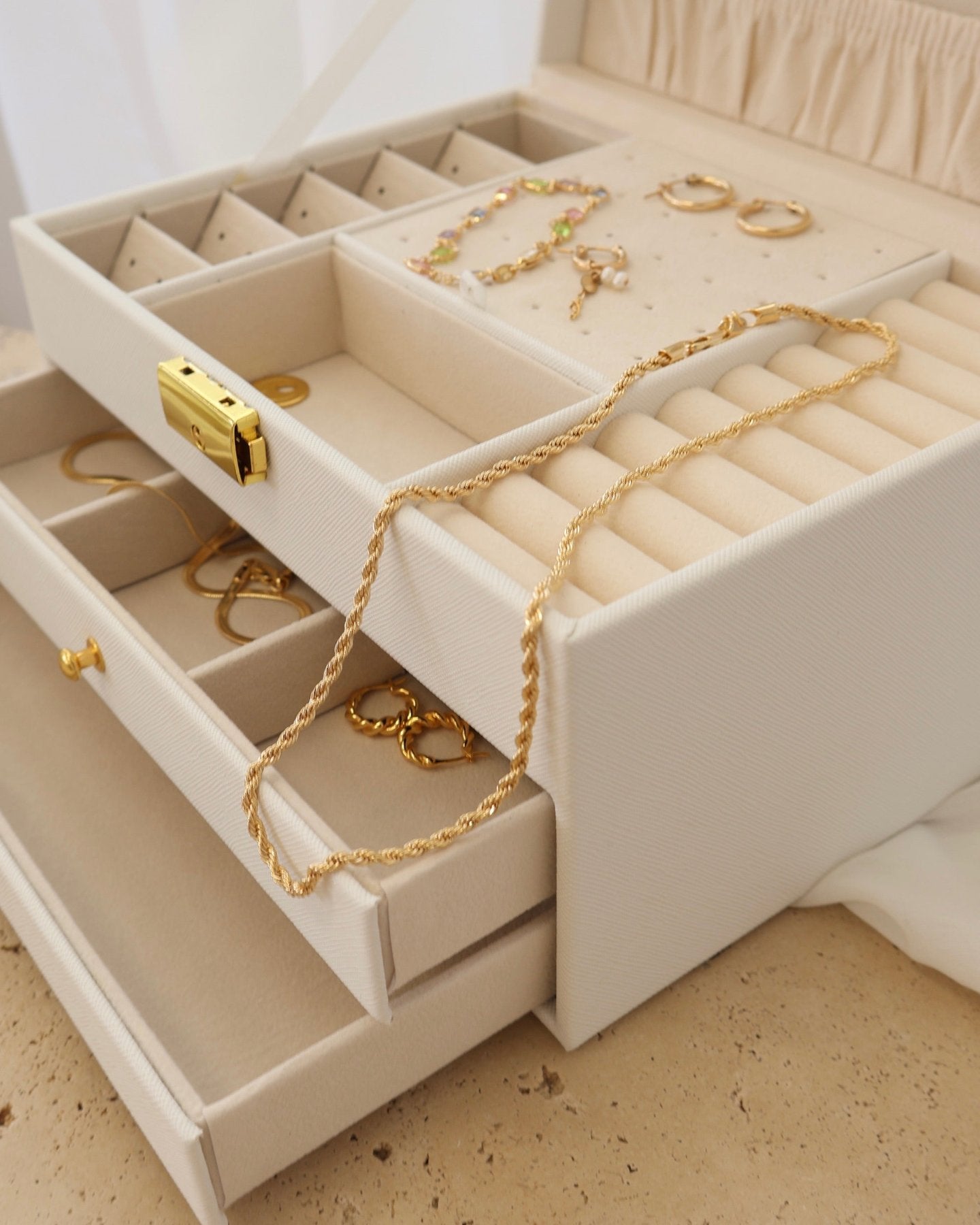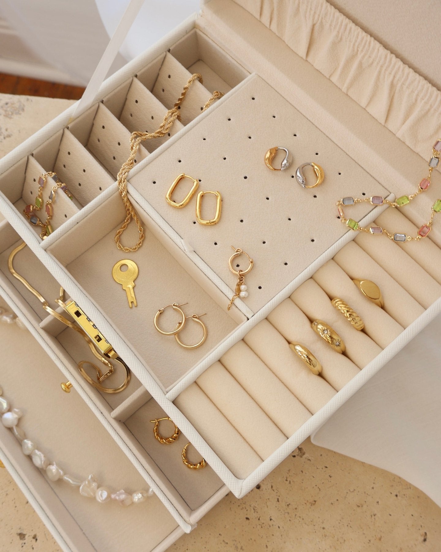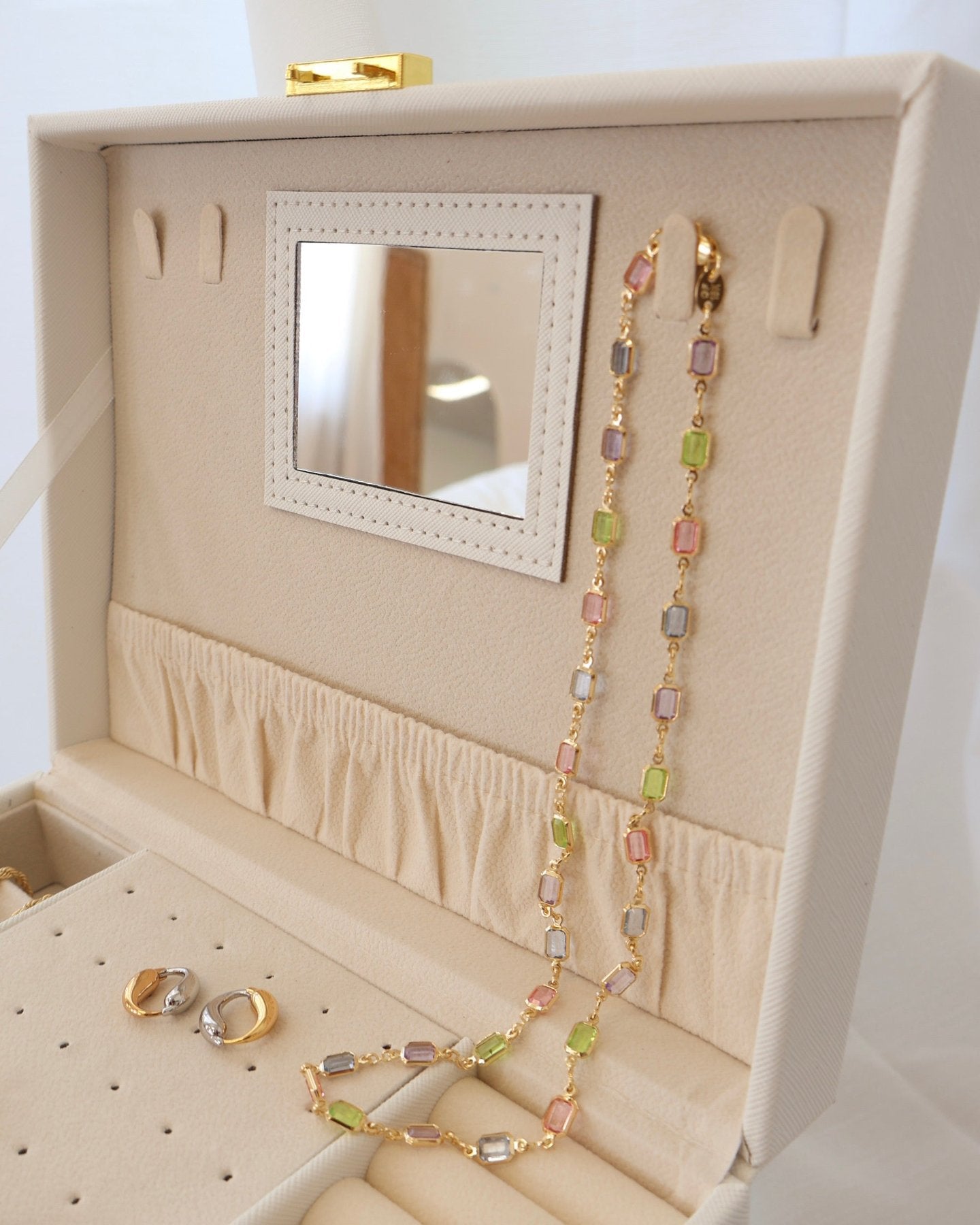 Our Jewellery Box is crafted from luxurious, buttery vegan leather, offering a sophisticated solution for storing your most treasured pieces. Embossed with our logo, it combines style and functionality in one beautifully designed case. Spacious and thoughtfully organised, it provides the perfect storage for your FR jewellery. Whether at home or on the go, this jewellery box is the ultimate companion for keeping your collection organised, protected, and beautifully displayed.