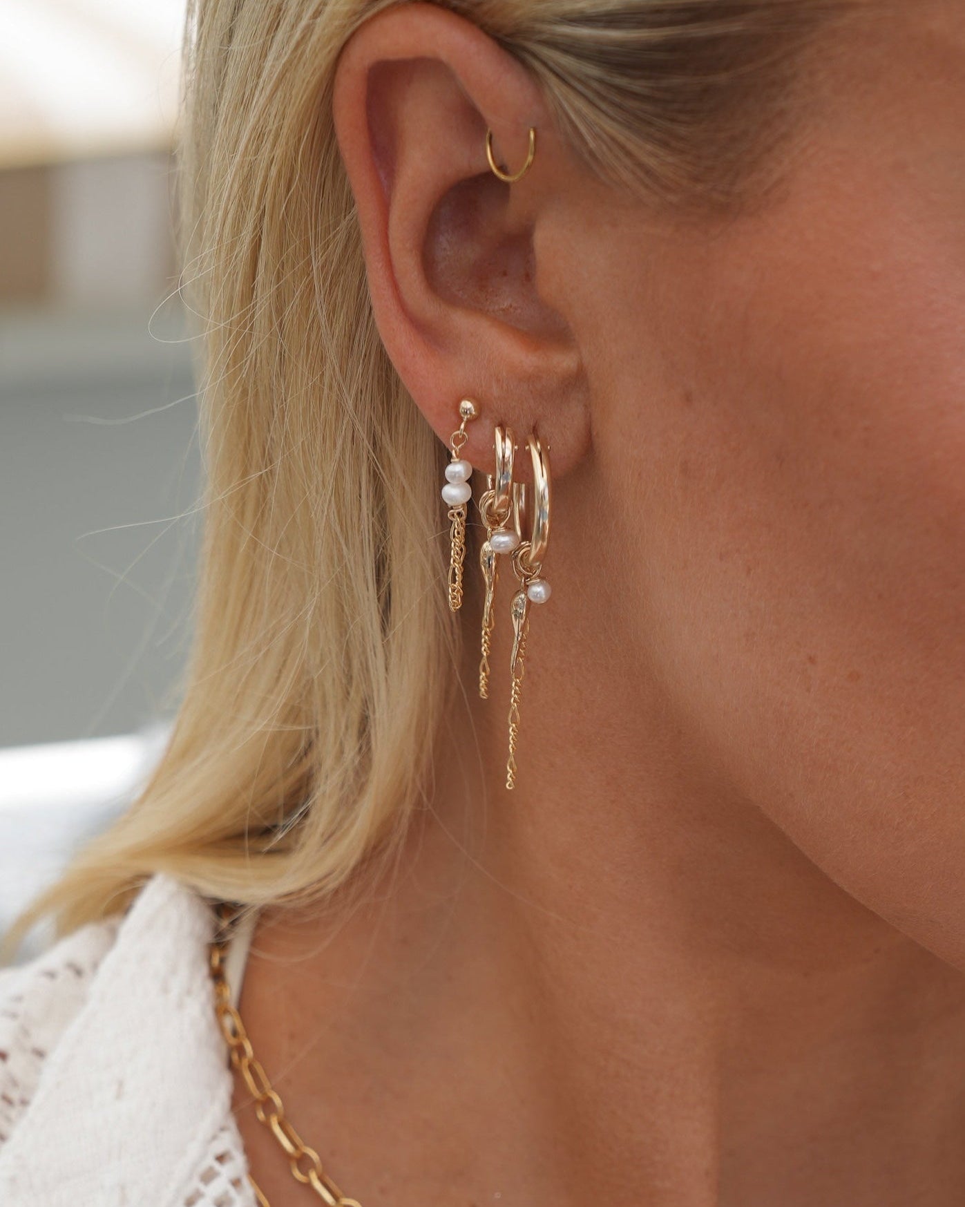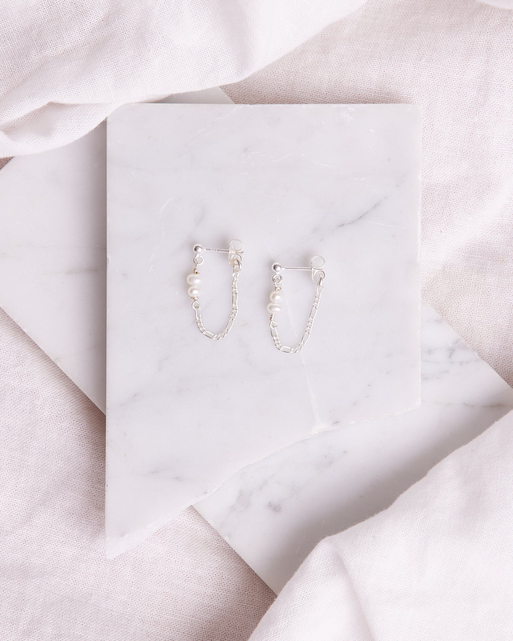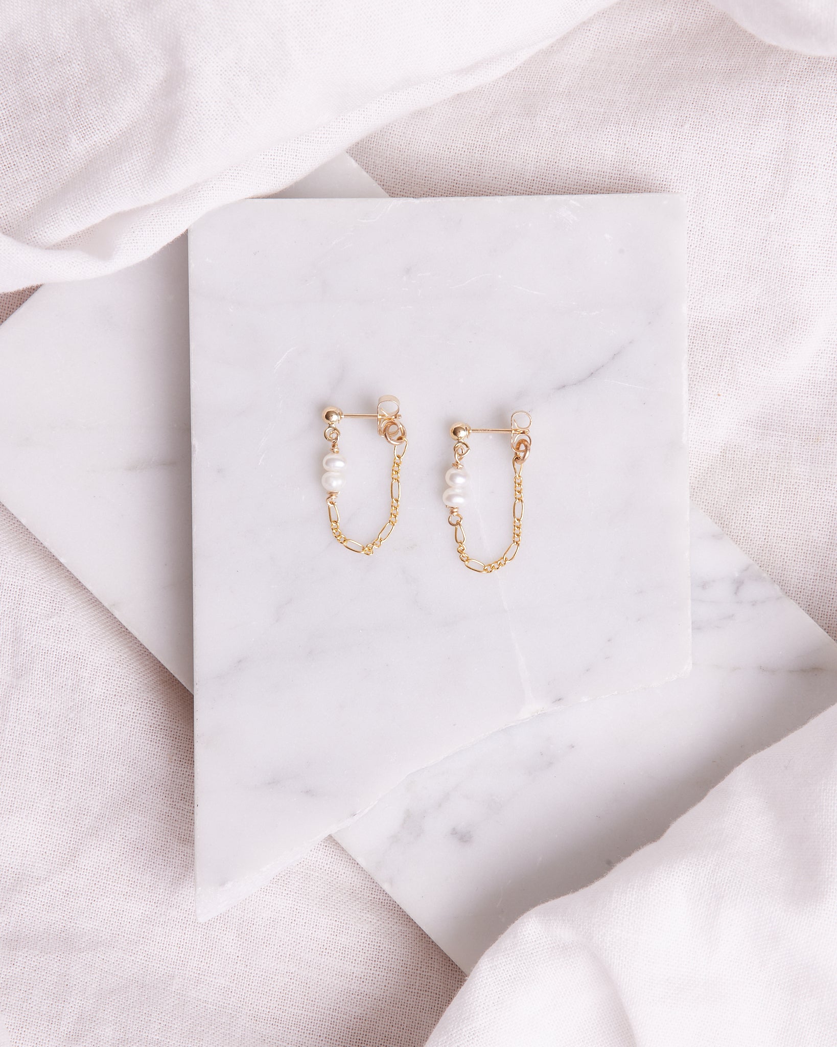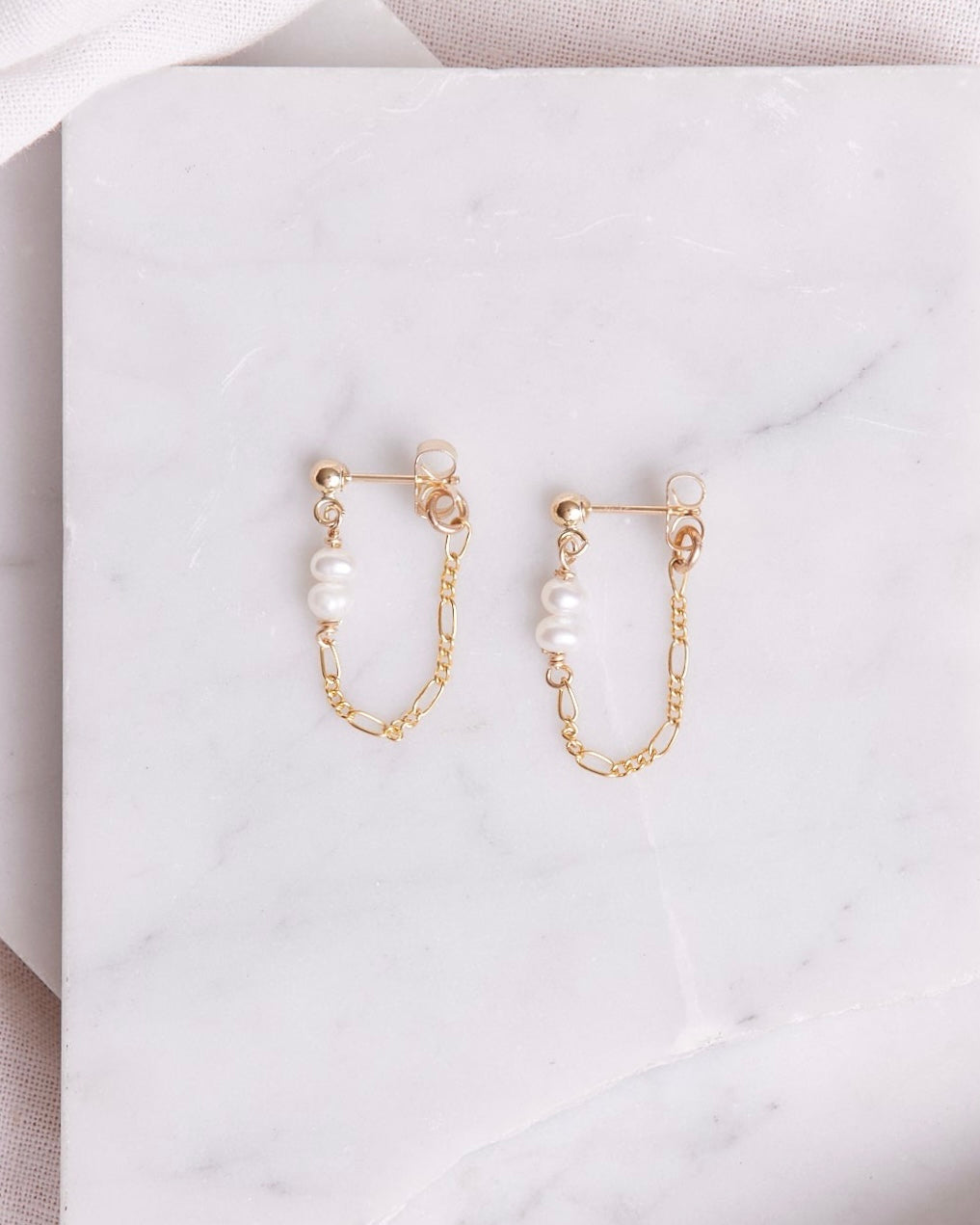 Available in 14k Gold Filled or 925 Sterling Silver is our Willow Studs, featuring 2 freshwater pearls on a ball stud with our classic figaro chain.