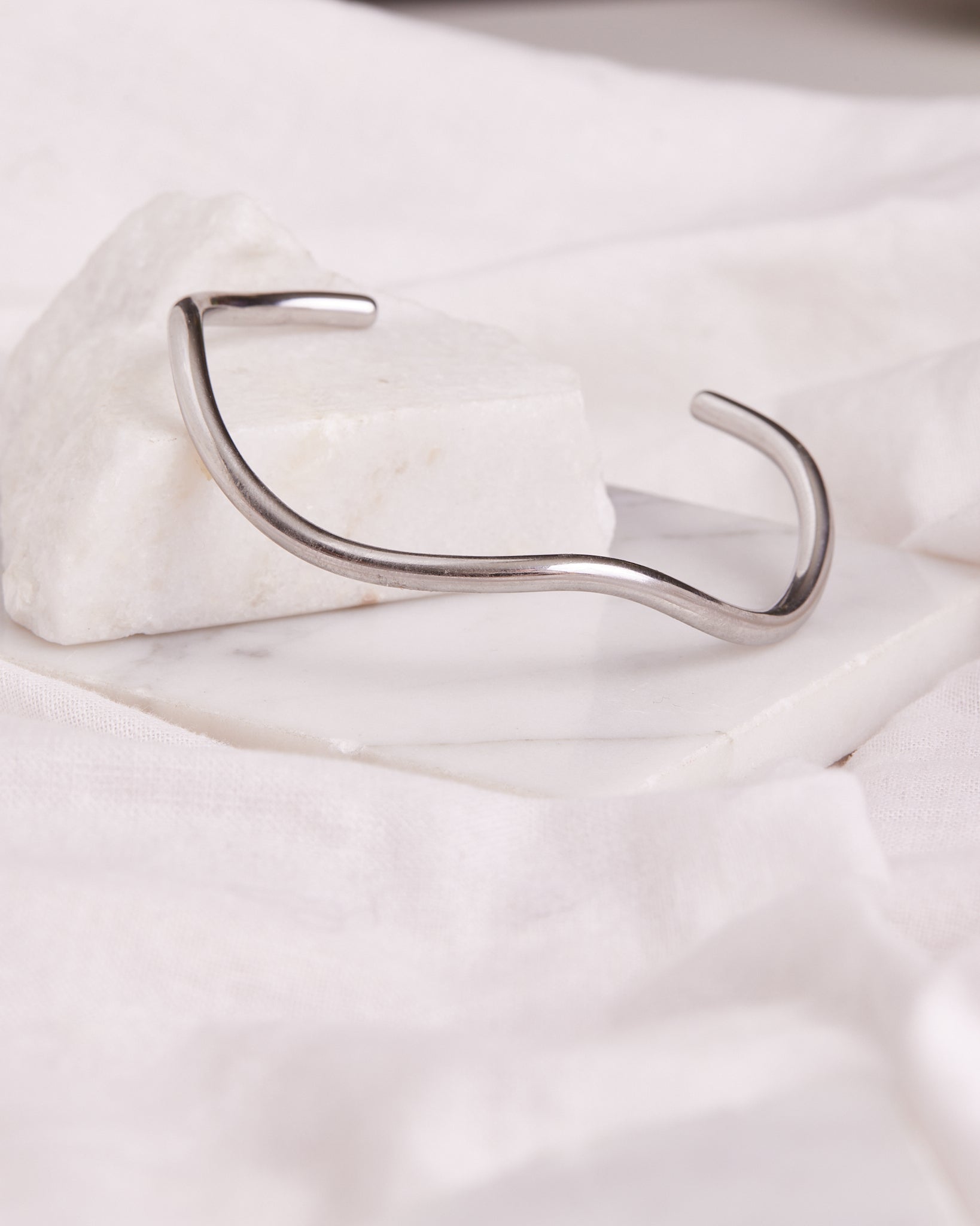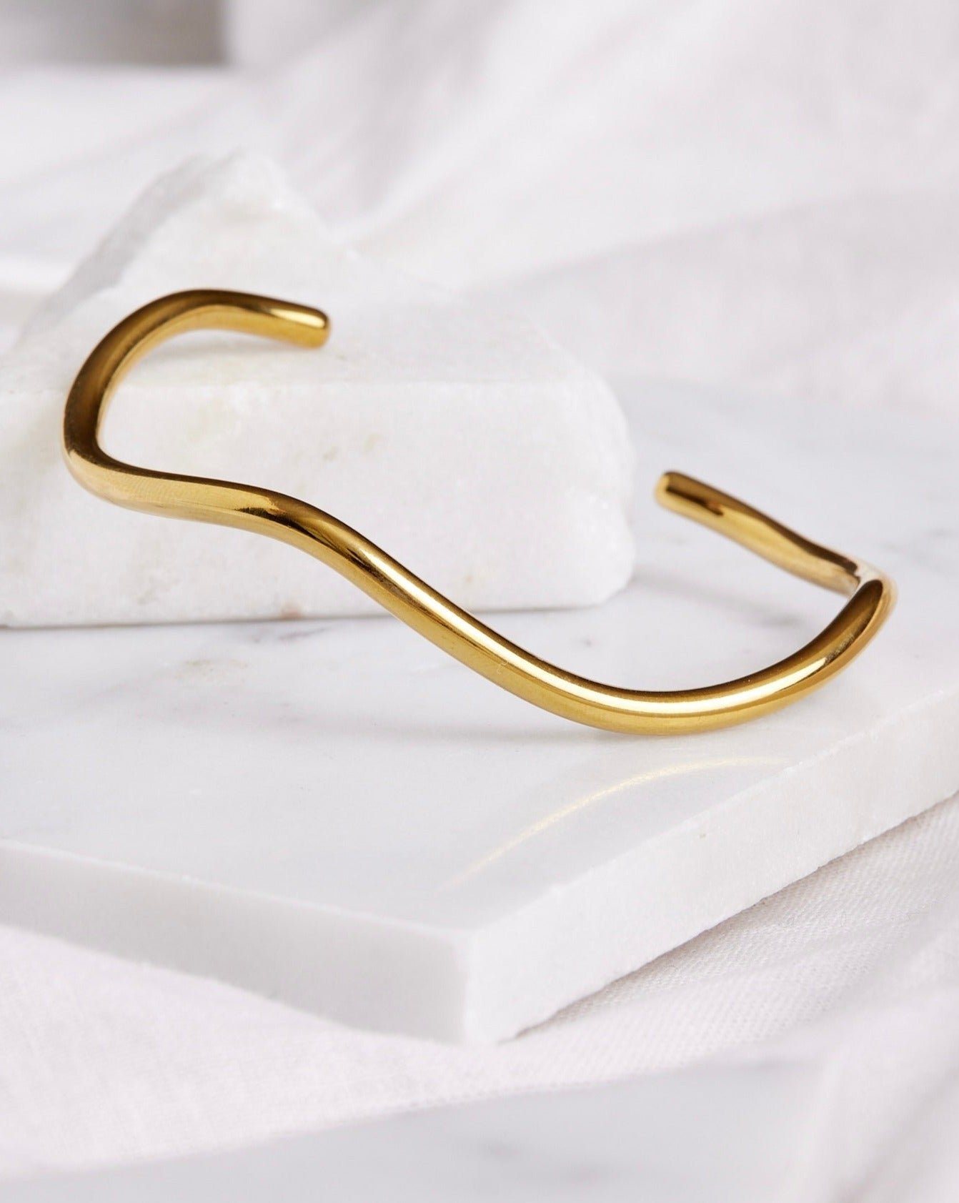 Made from 316 Stainless Gold and Silver, The Wave Bangle naturally curves around your wrist.