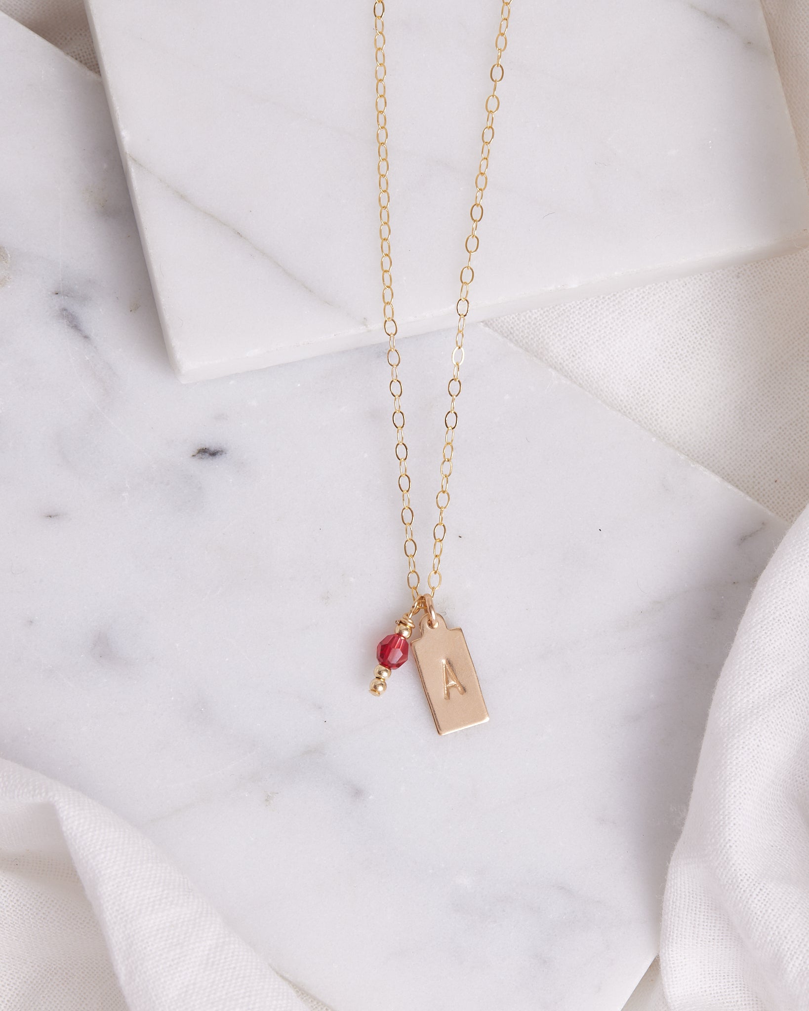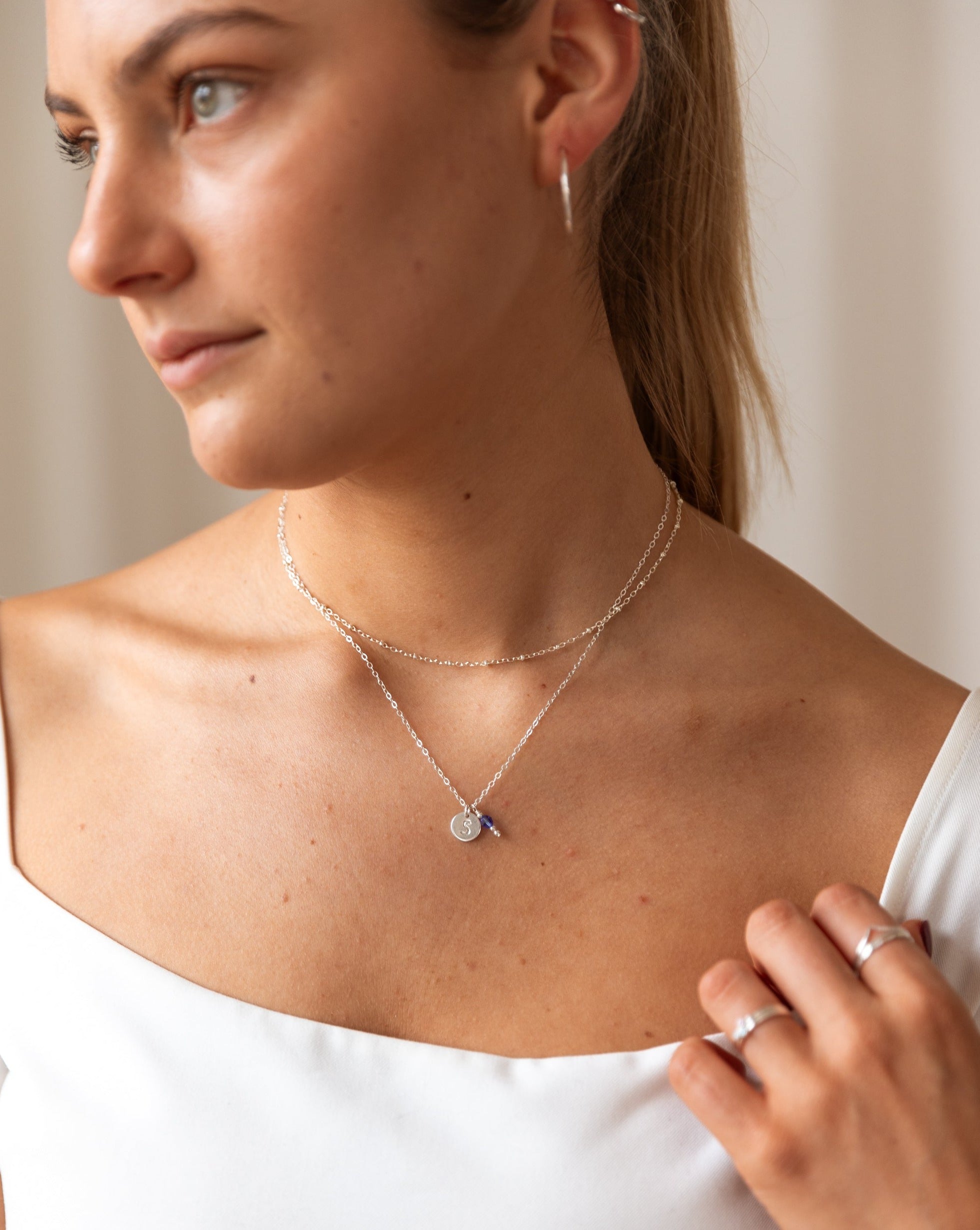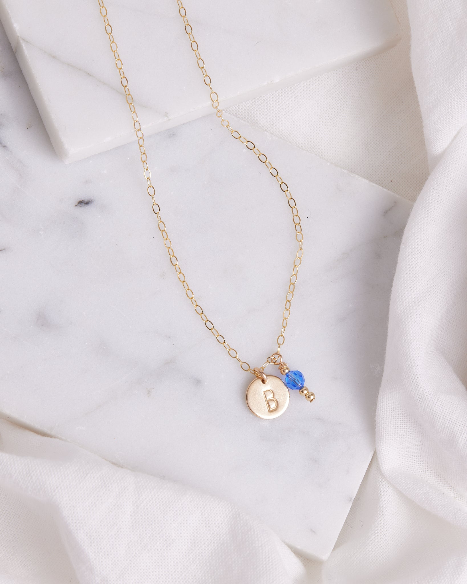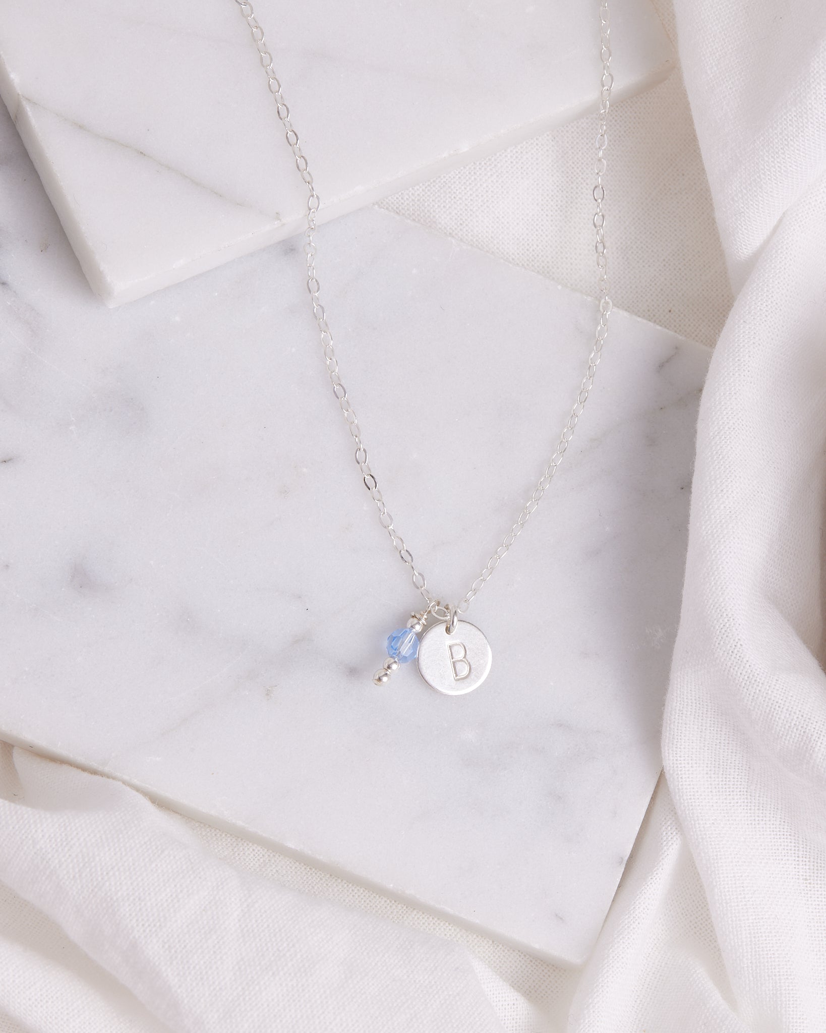 A meaningful piece designed just for you. Measuring 17", this necklace features a personalised initial disc paired with a hand-wrapped Swarovski birthstone bead - simple, elegant, and uniquely yours.