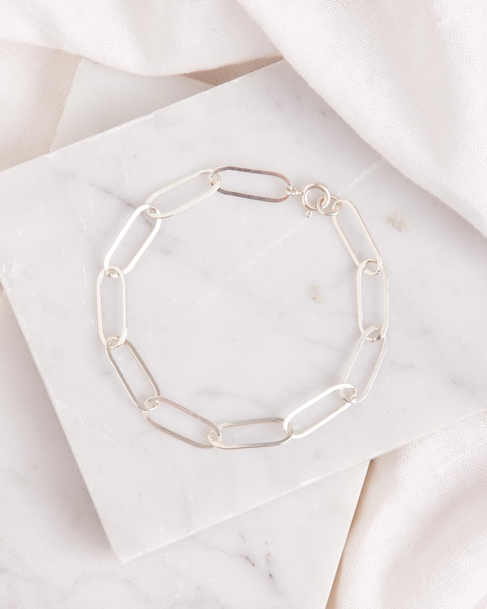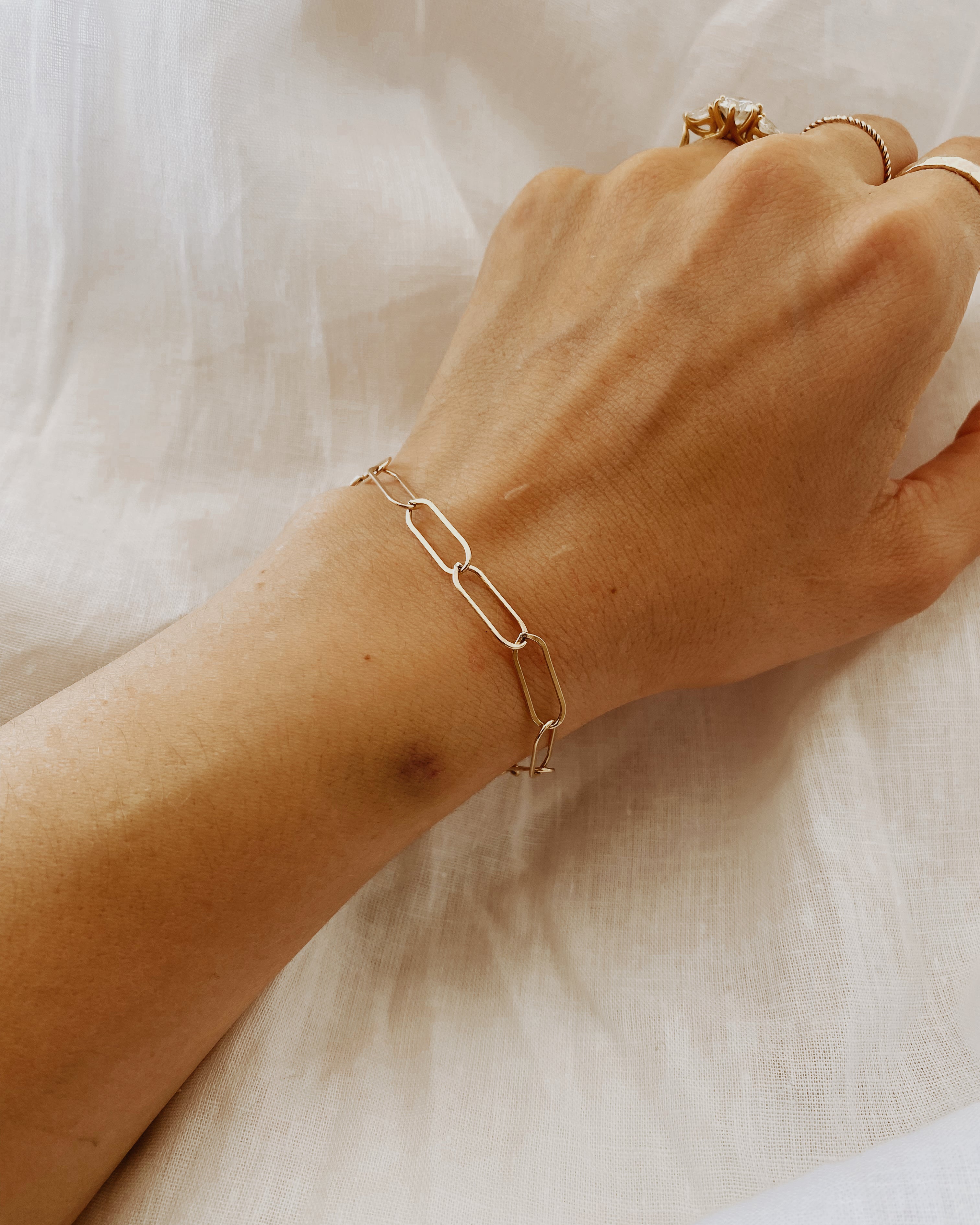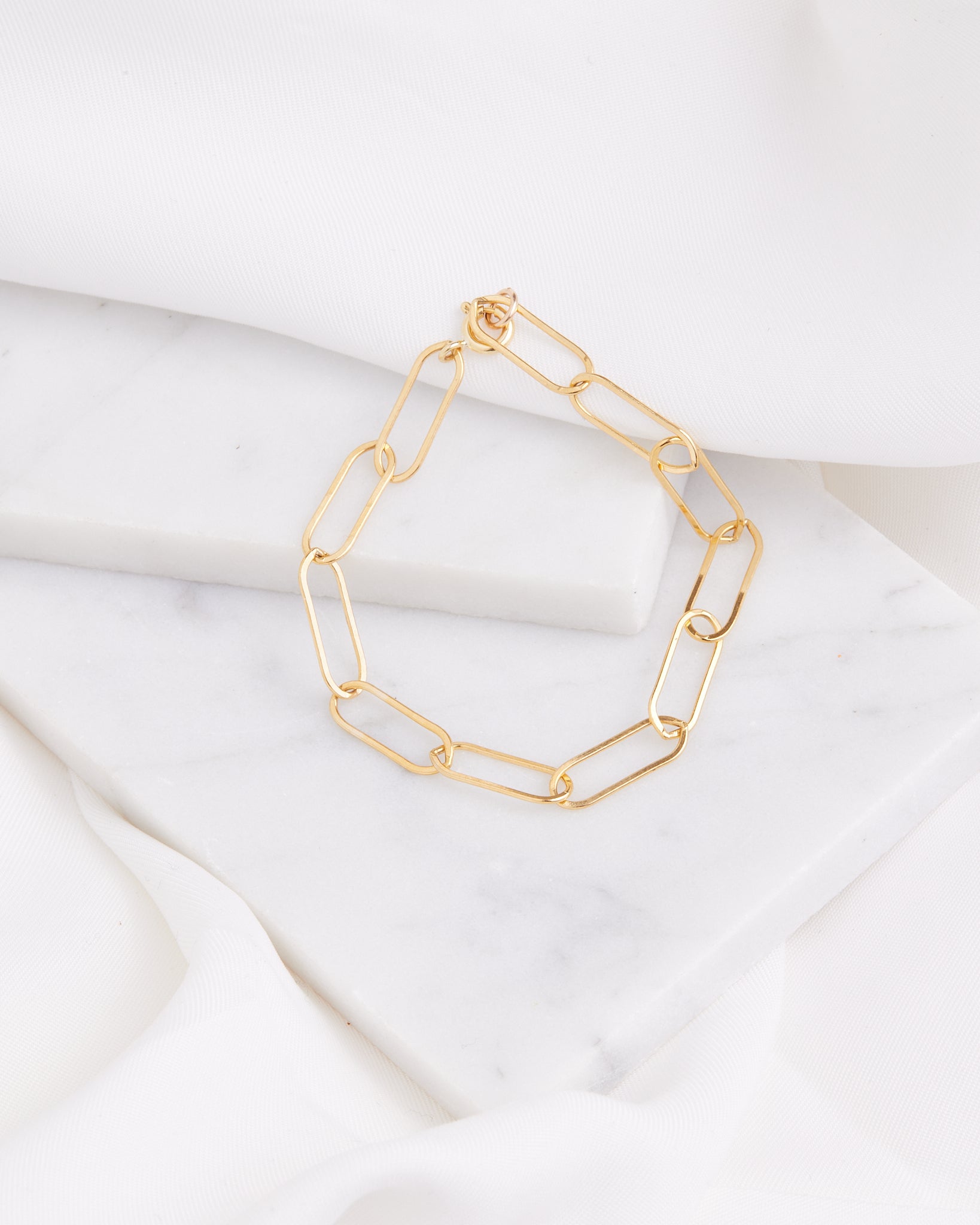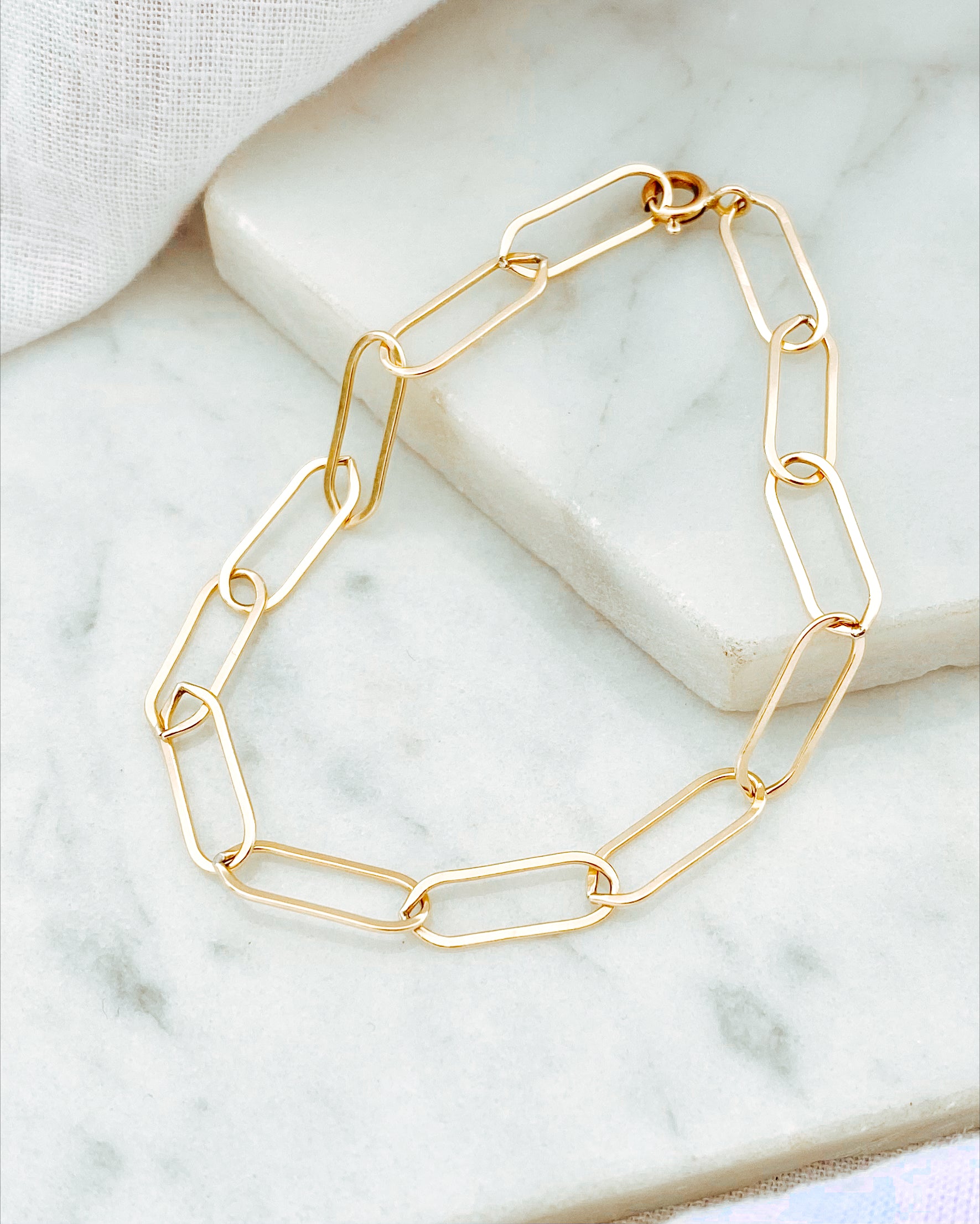 Our individually handmade elongated linked bracelet in 14k gold filled is the perfect minimal statement for everyday wear!