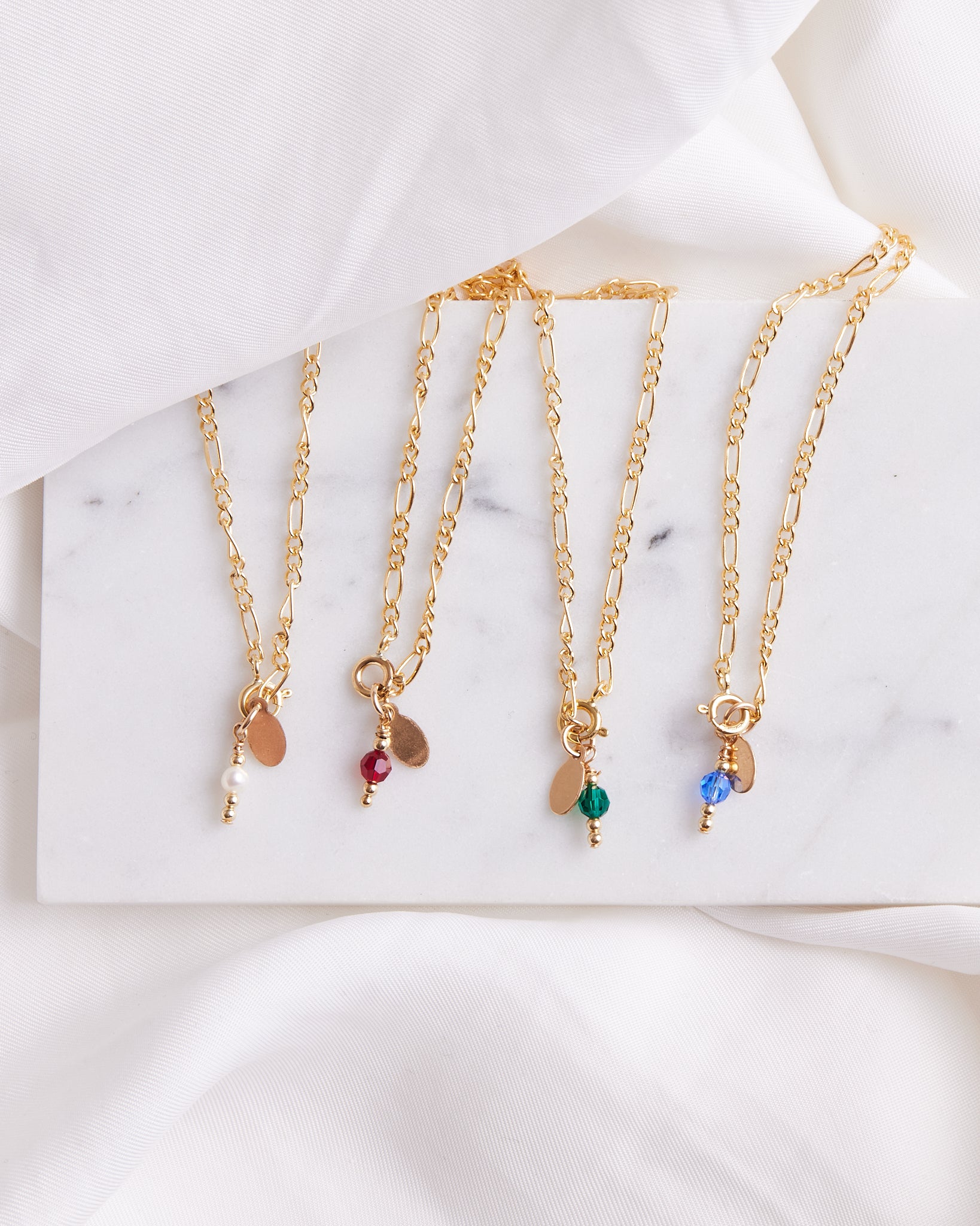 Hand crafted in 14k Gold Filled or 925 Sterling Silver, each clasp is finished off with a Swarovski gem and a gold disc.
