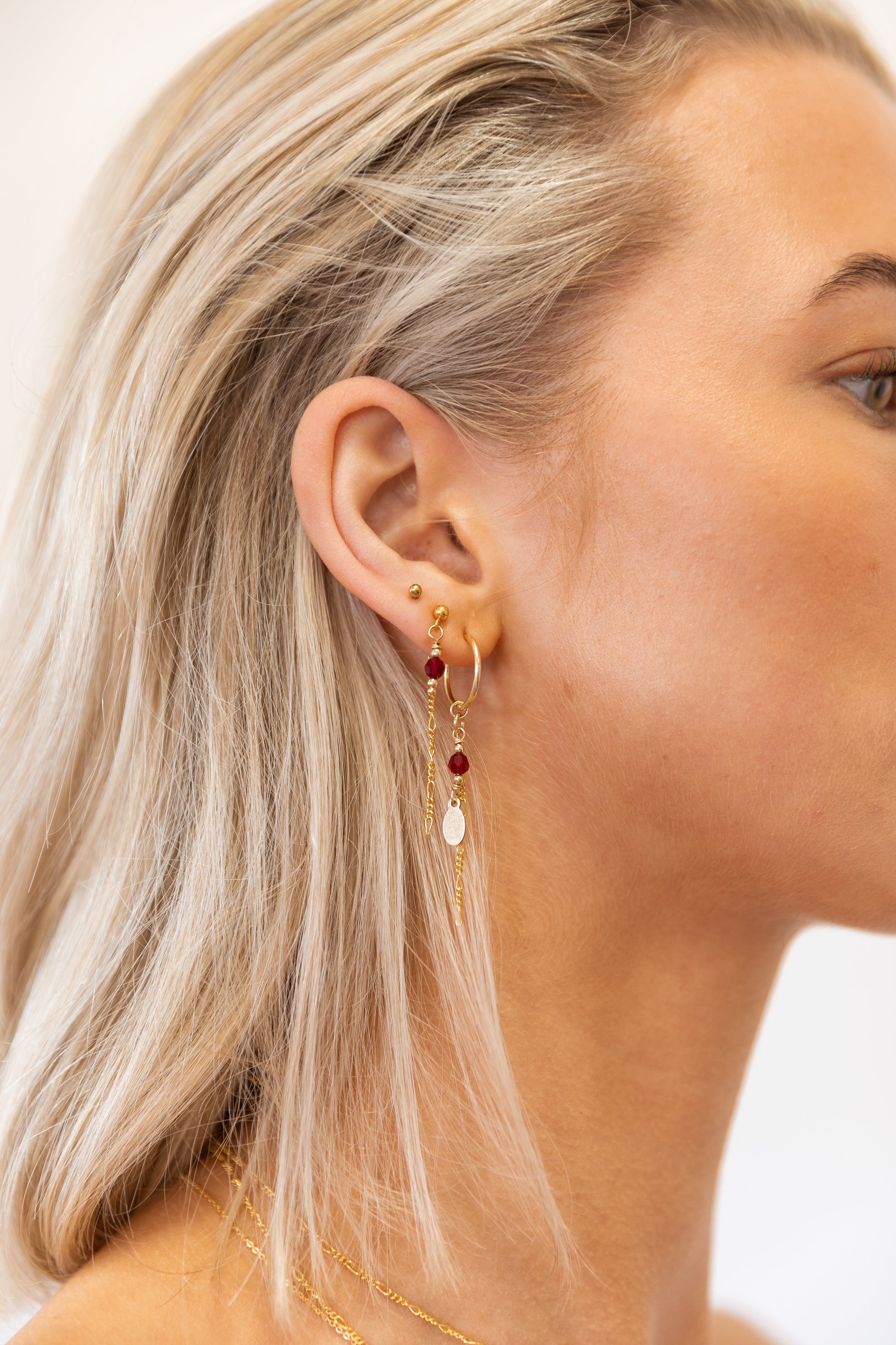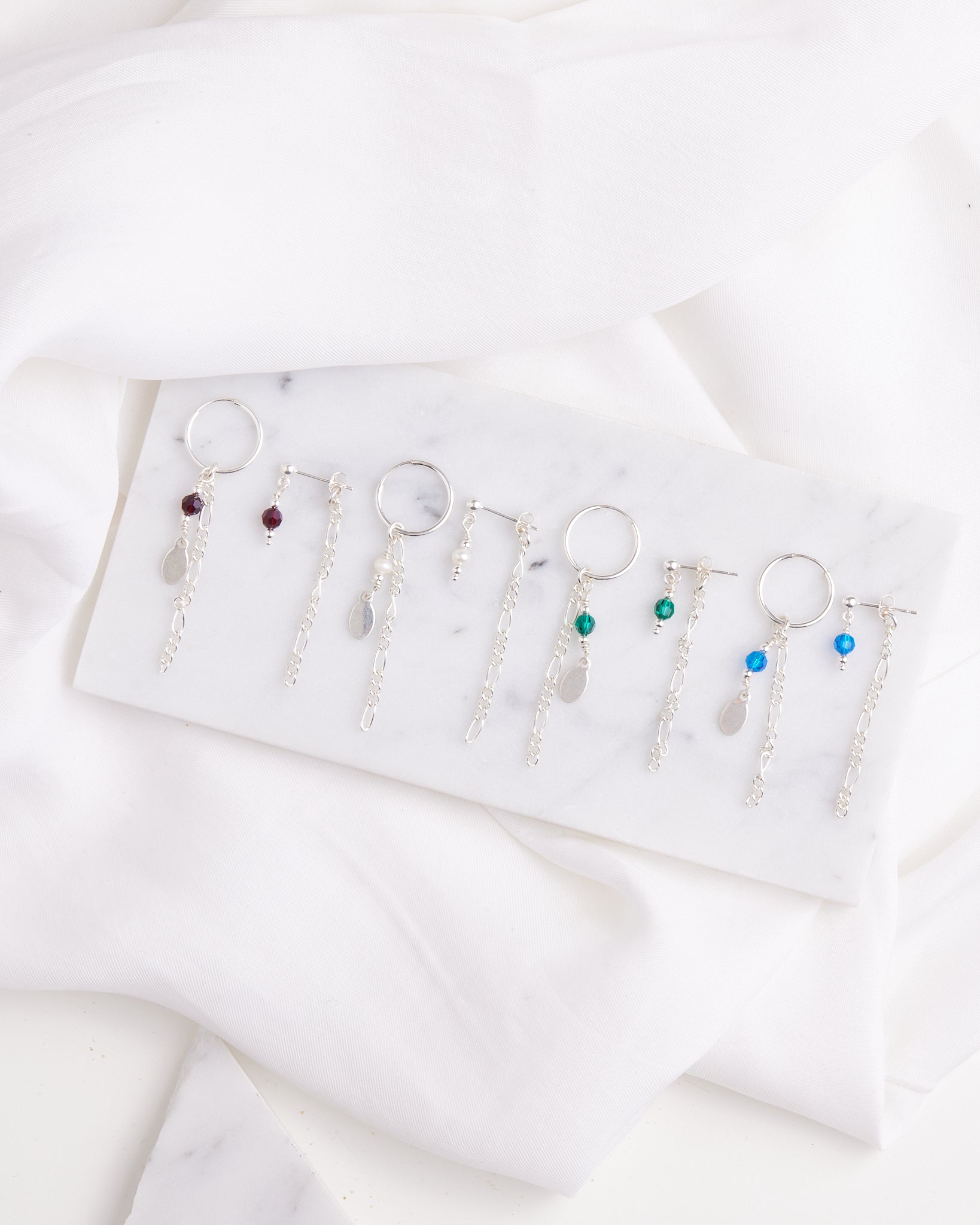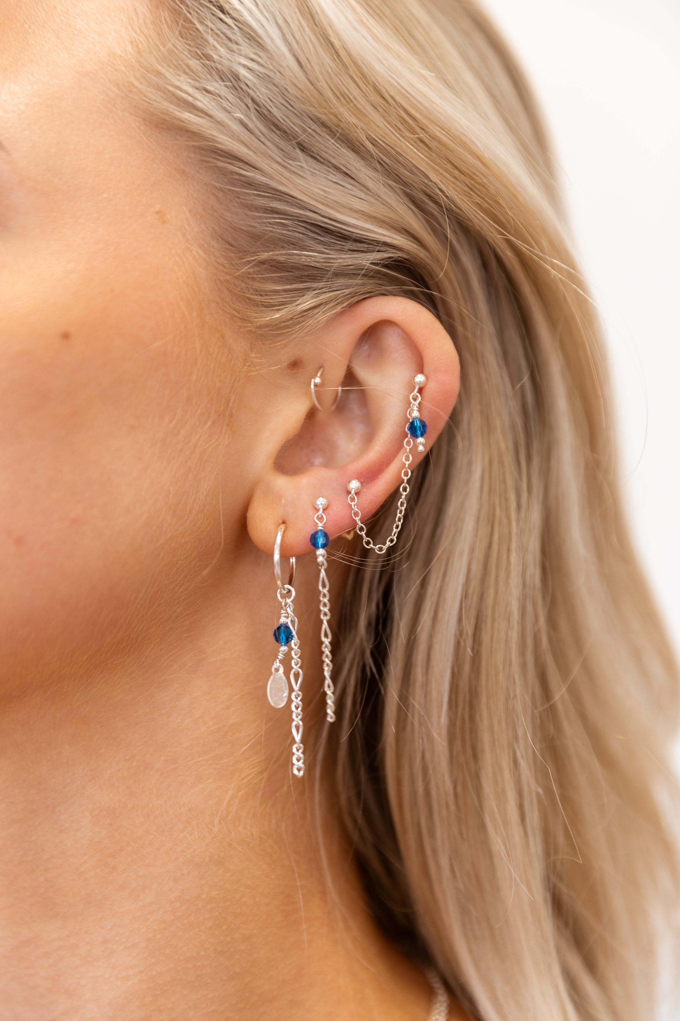 Spice up your earring stack with our latest mix n match set. Includes a ball stud with chain and Swarovski detailing along with a matching twist hoop.