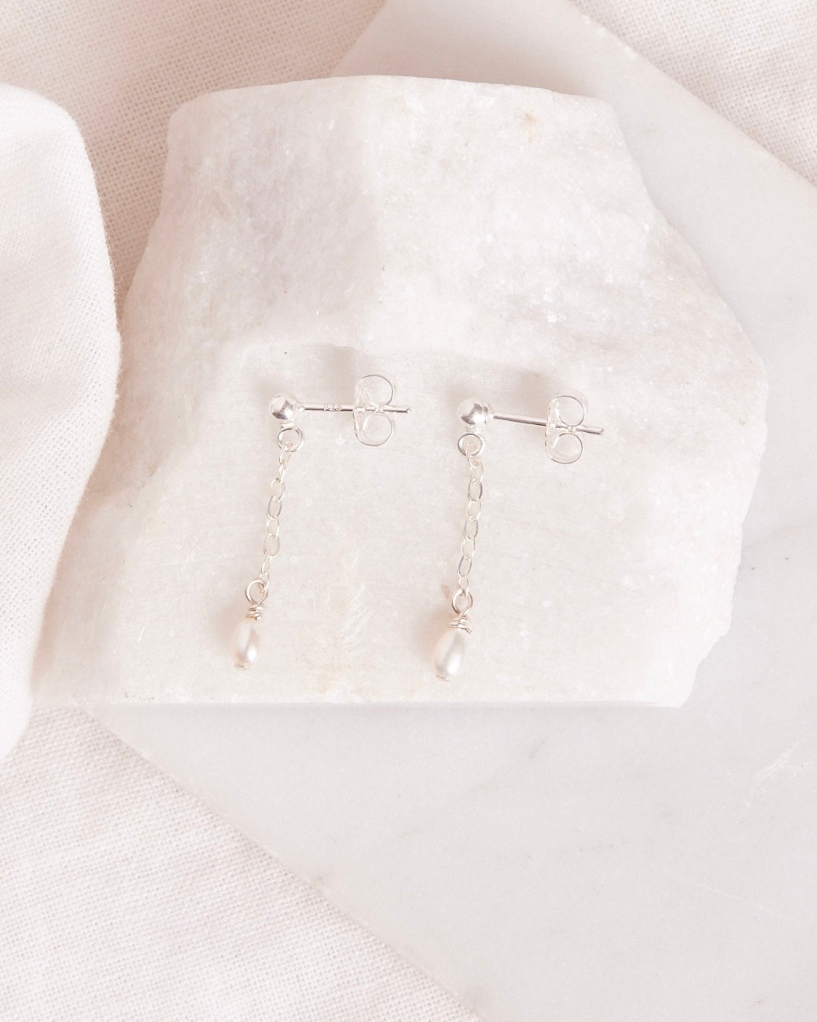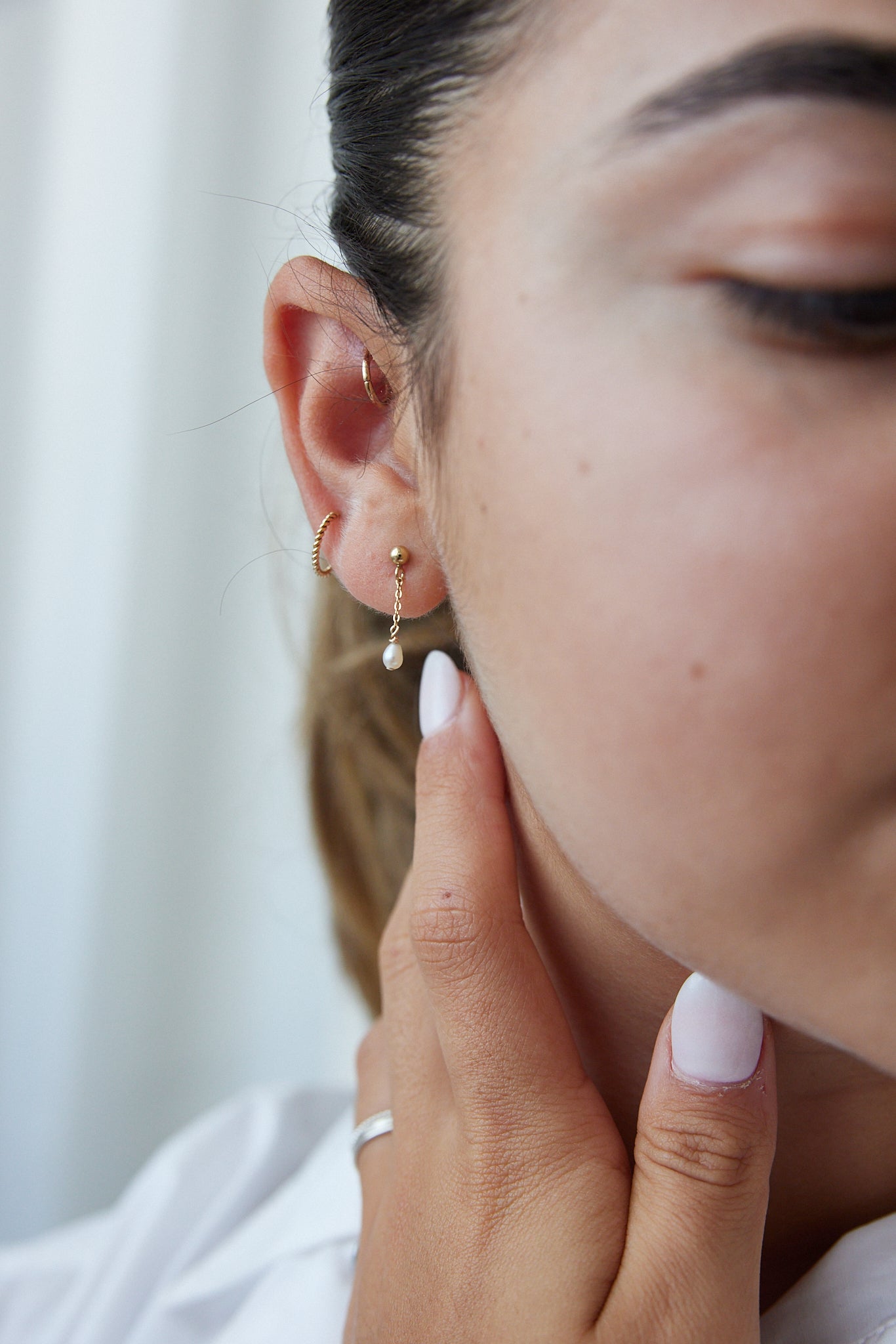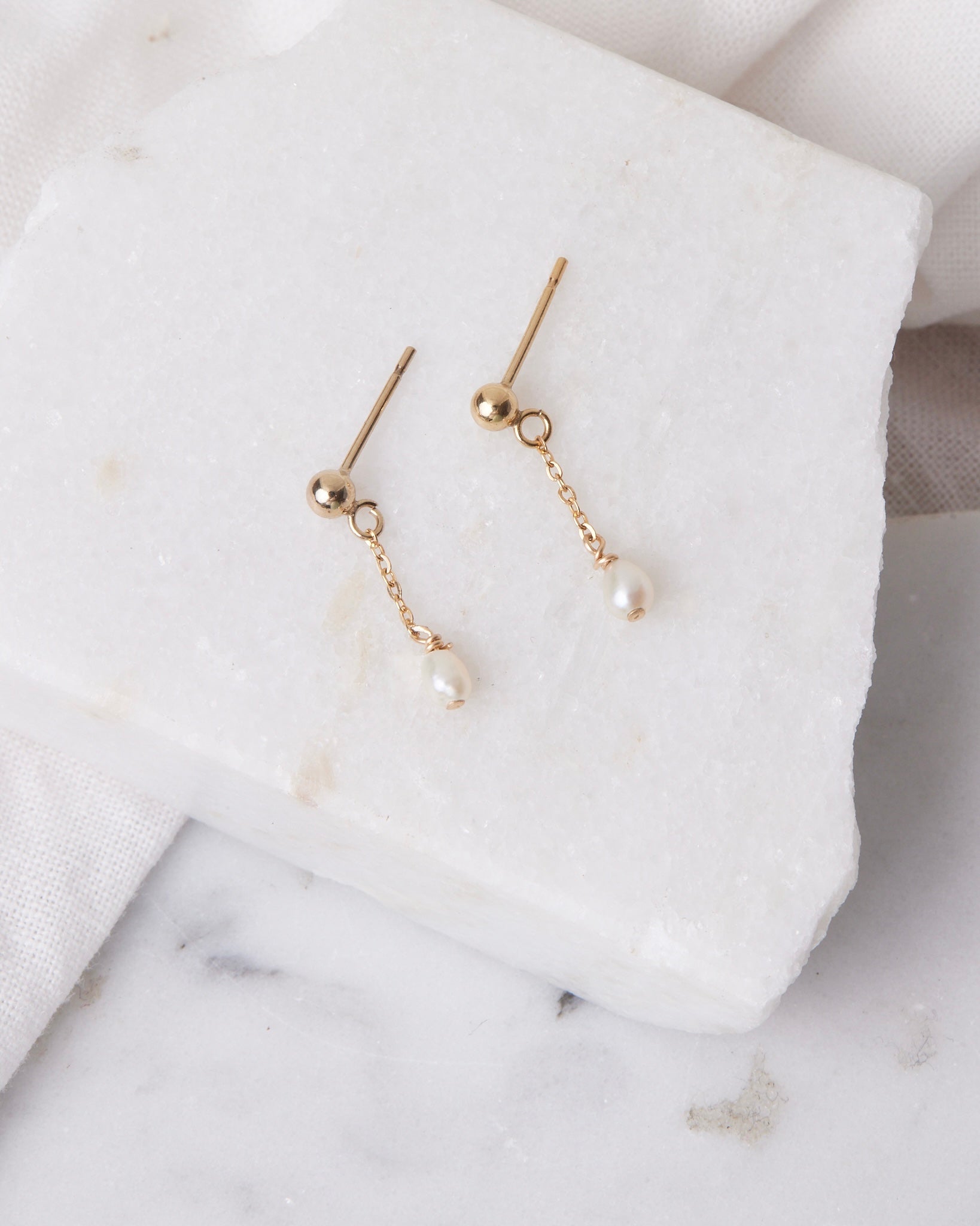 Available in 14k Gold Filled or 925k Sterling Silver Is our stunning minimalist style pearl drop stud.