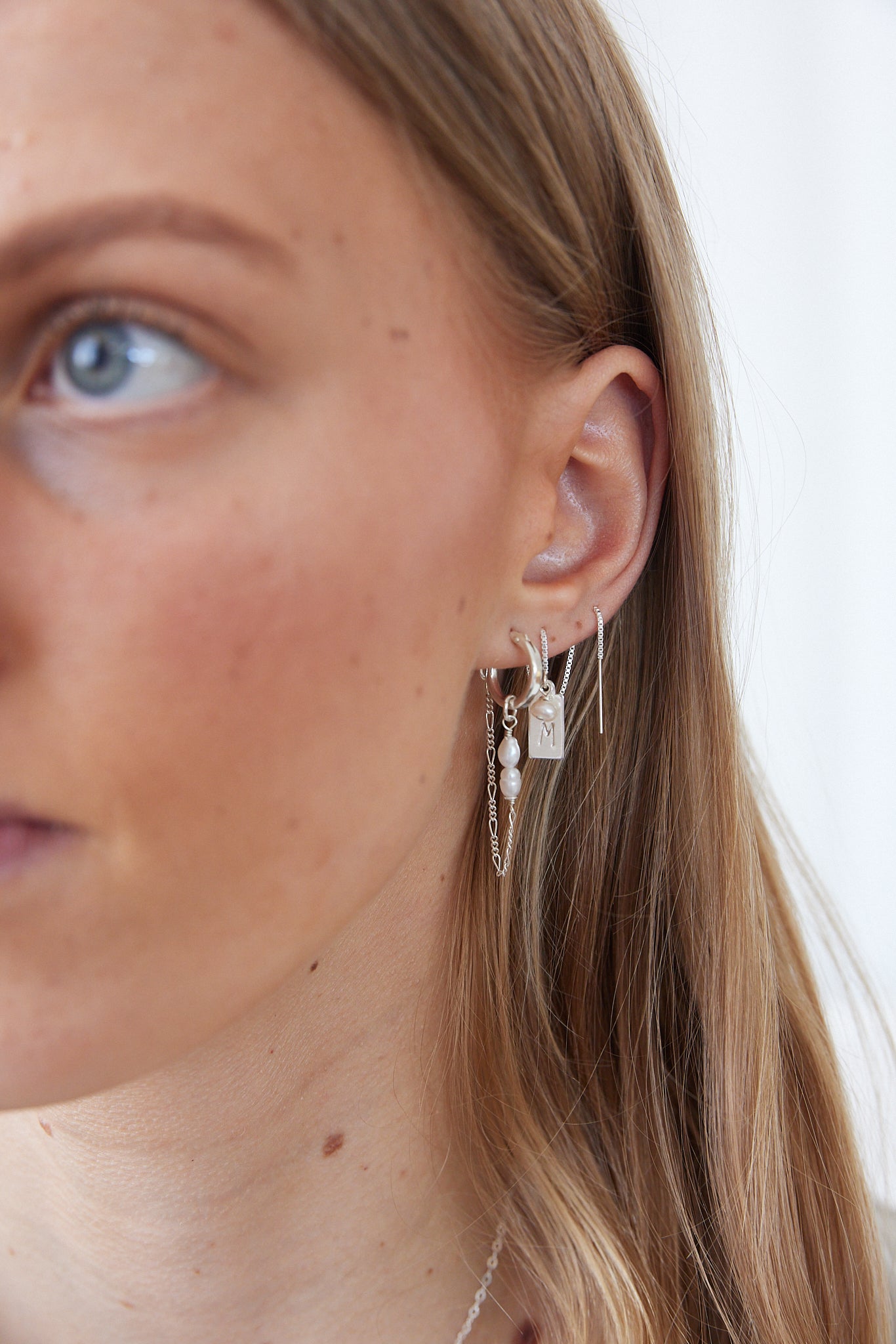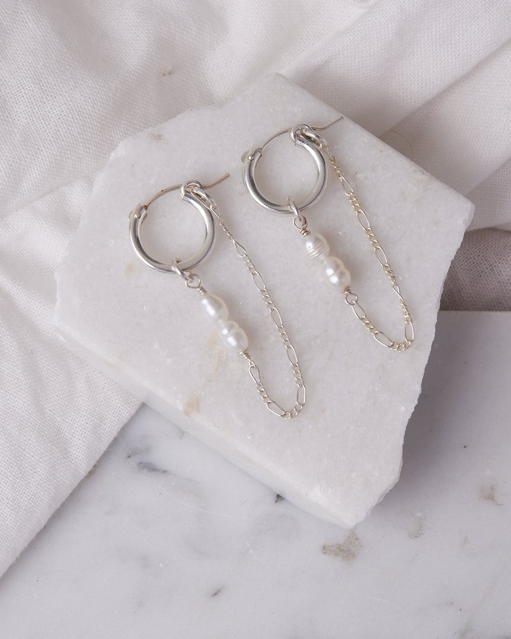 Emily Earrings are crafted on our Perfect Small Hoops, with a delicate chain linked around with two small pearls
