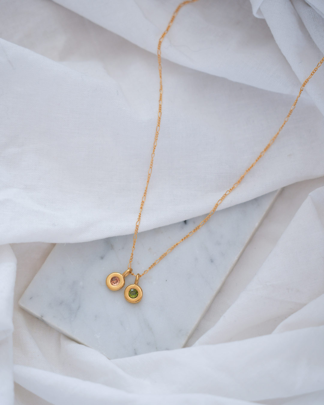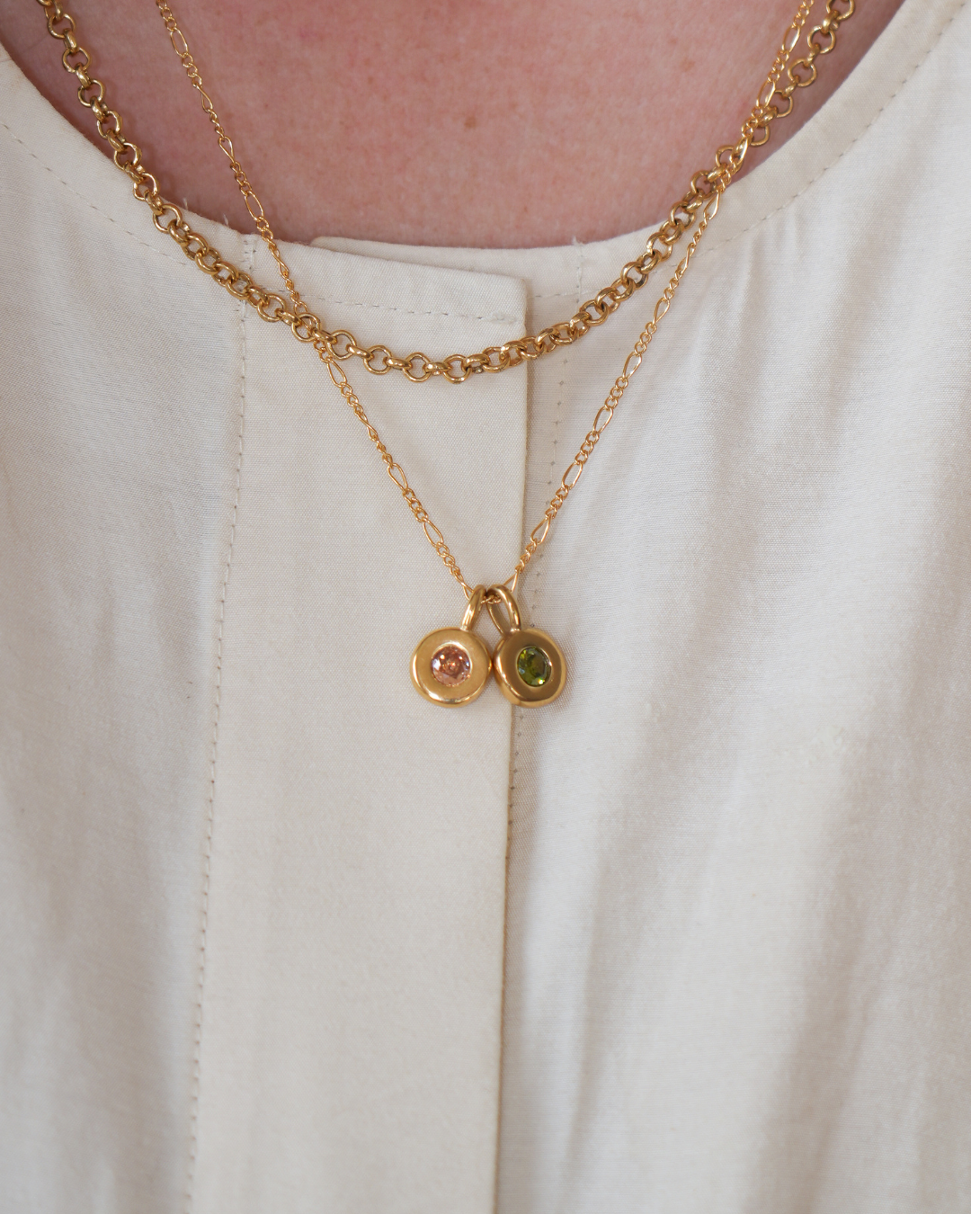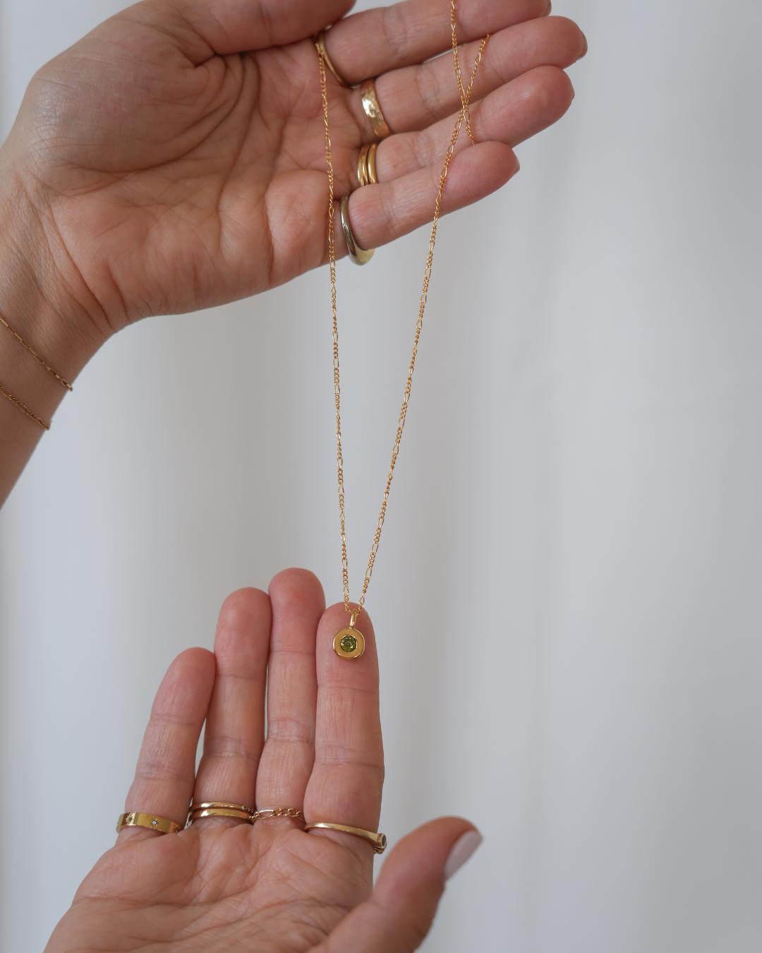 Featuring a gold stainless steel gemstone pendant on an 18" 14k Yellow Gold Filled Figaro chain with a 2" extension for adjustable length.