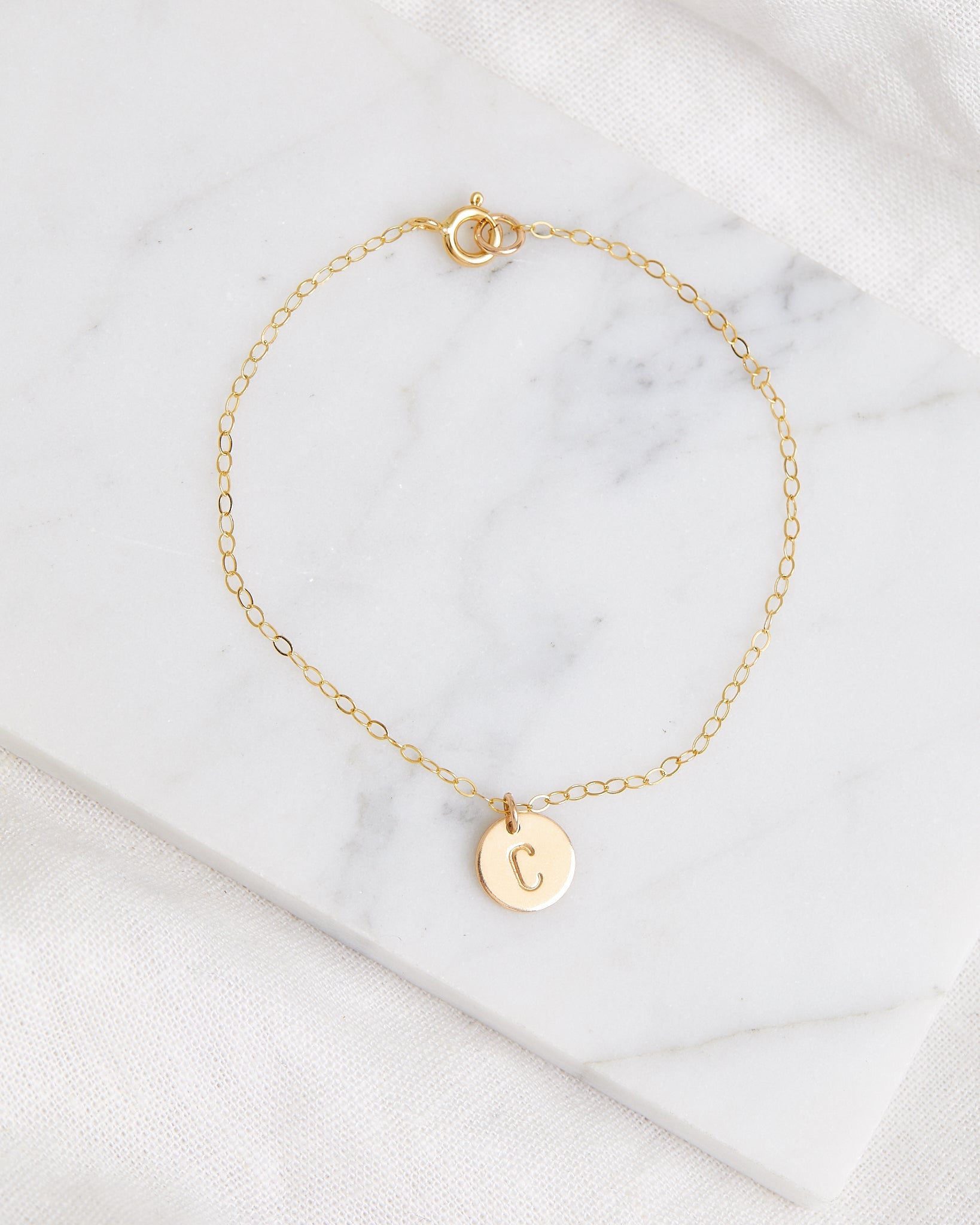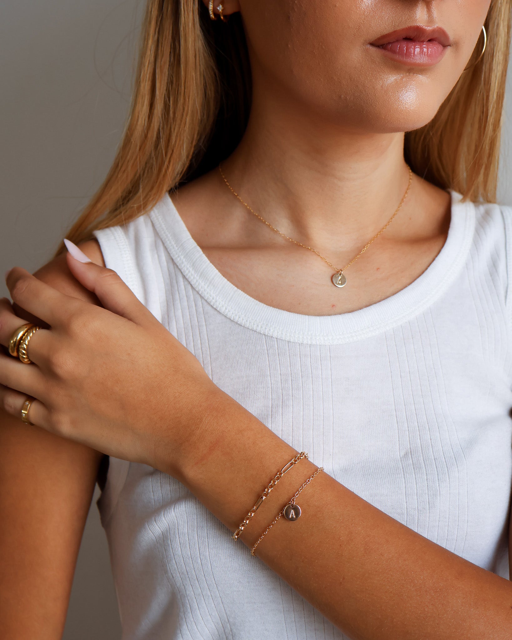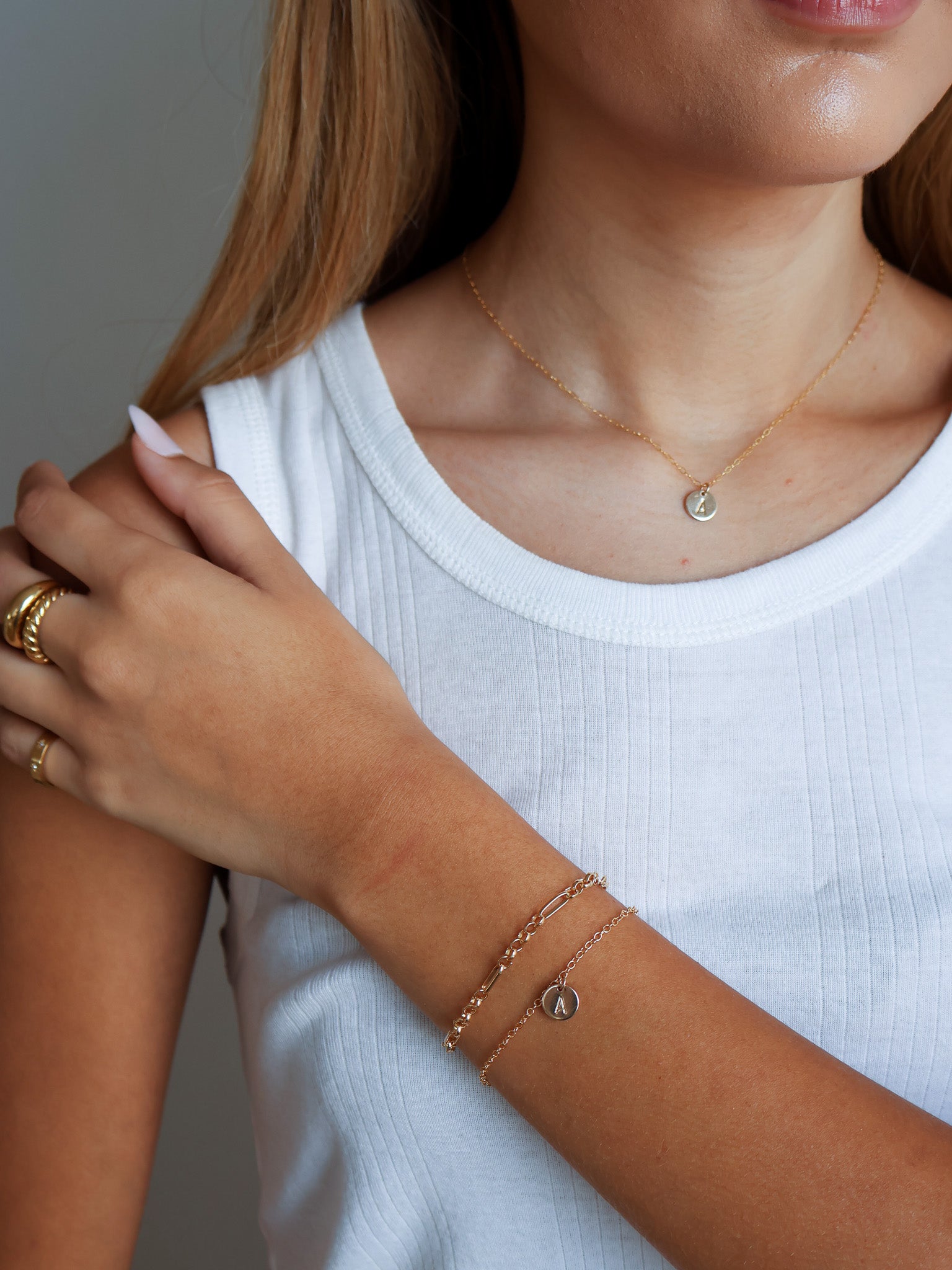 Minimalist and personal. The Circle Stamped Necklace and Bracelet are designed to complement each other, each featuring a delicate circular pendant ready to be stamped with your chosen letter, perfect for a coordinated, meaningful set.