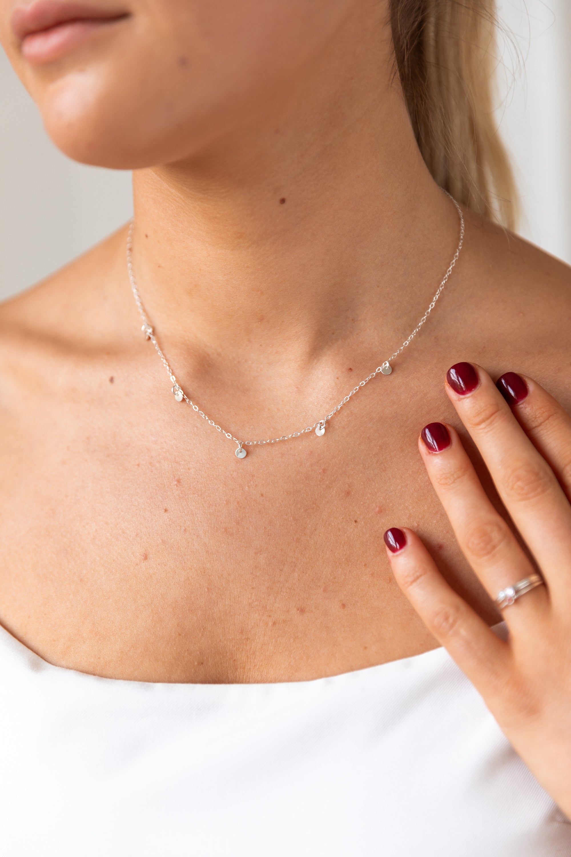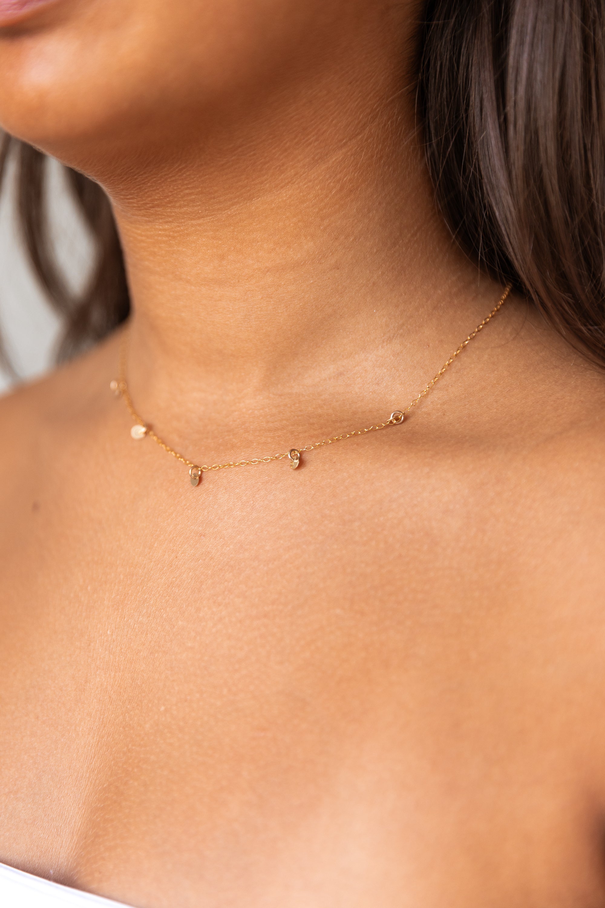 The necklace measures 17" in length and features small, delicate, tiny coin discs for a subtle, elegant touch. To add extra length, please click here.