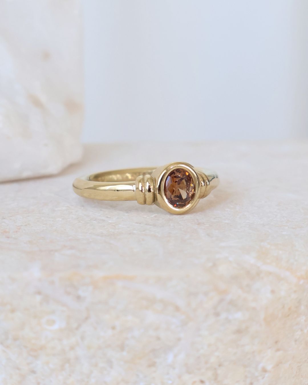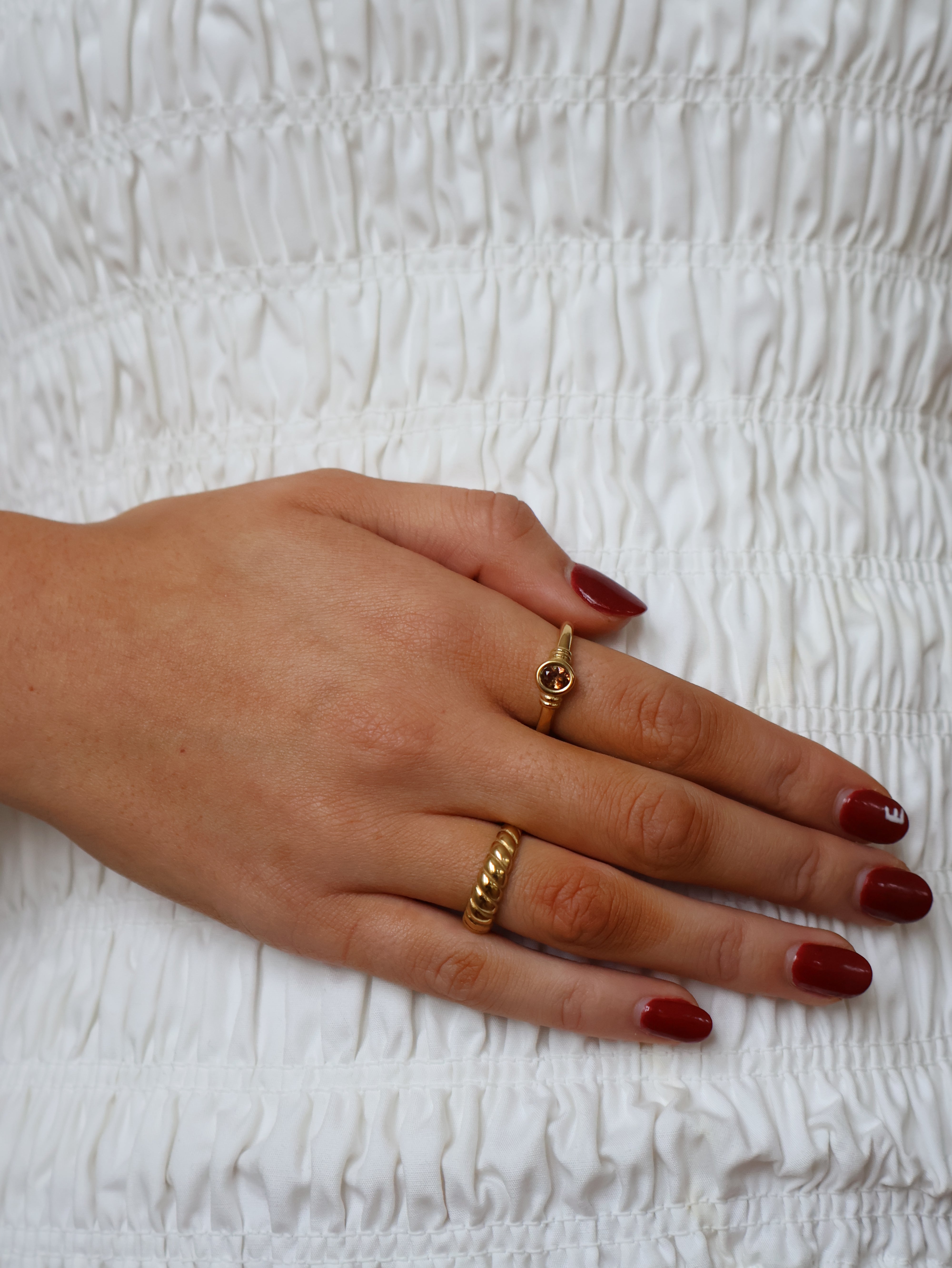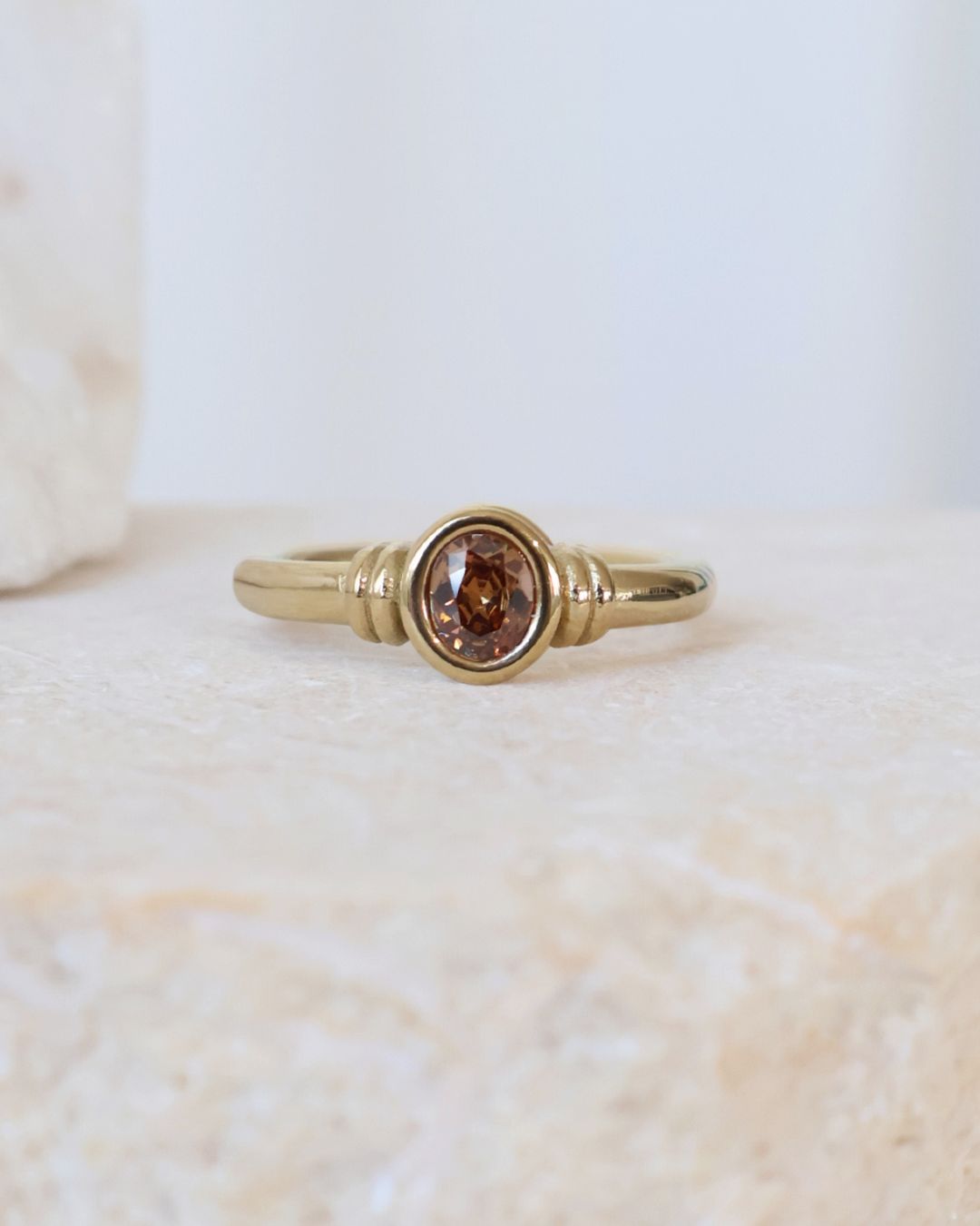 Timeless elegance meets everyday durability in the Florence Ring. Featuring a warm brown gemstone in a classic bezel setting, this piece evokes vintage charm with its subtle engraved detailing. Crafted from tarnish-resistant stainless steel, it’s designed to last-making it the perfect keepsake you'll wear for years to come. Whether stacked or worn solo, the Florence Ring adds a touch of understated luxury to any look.