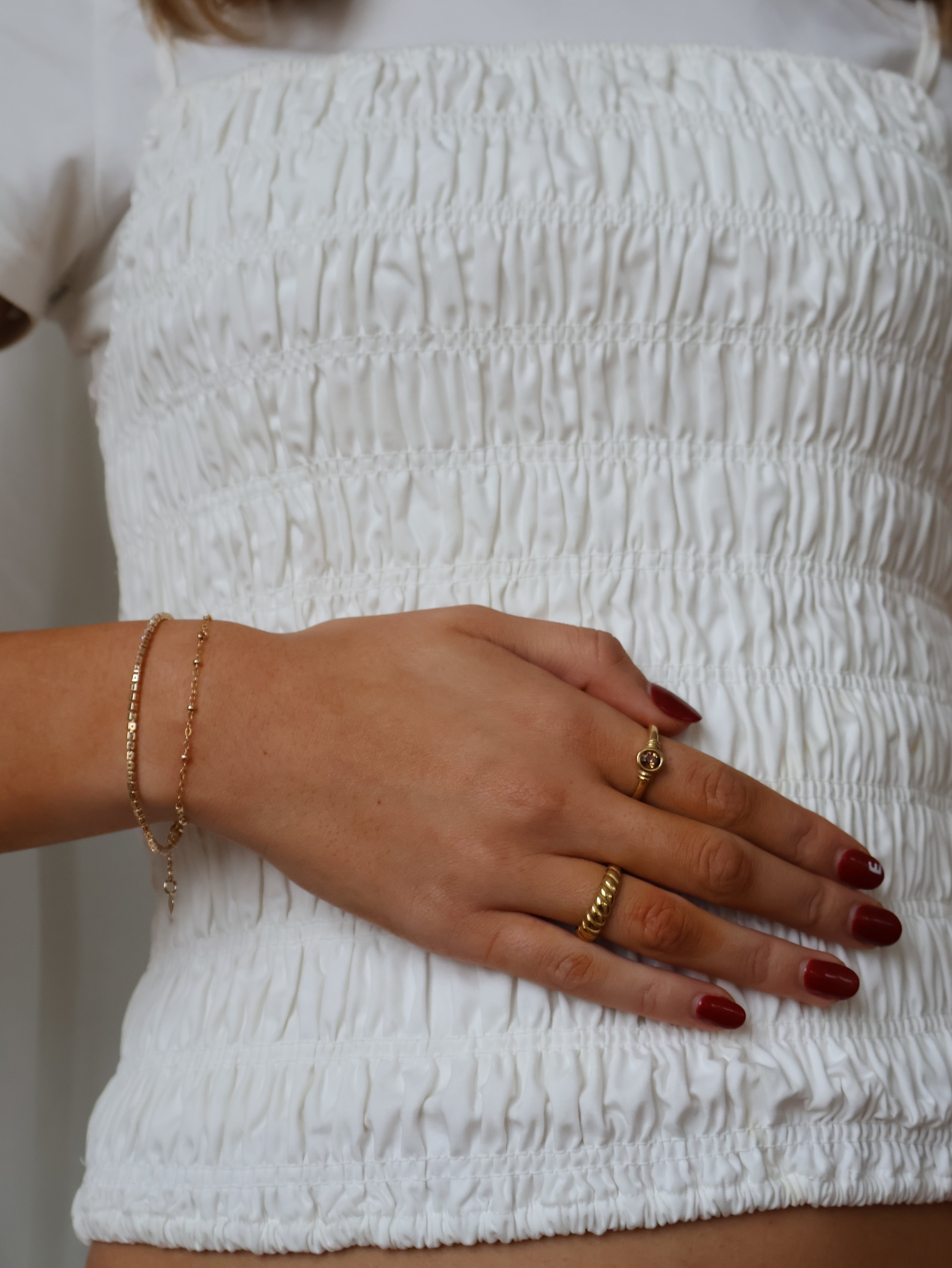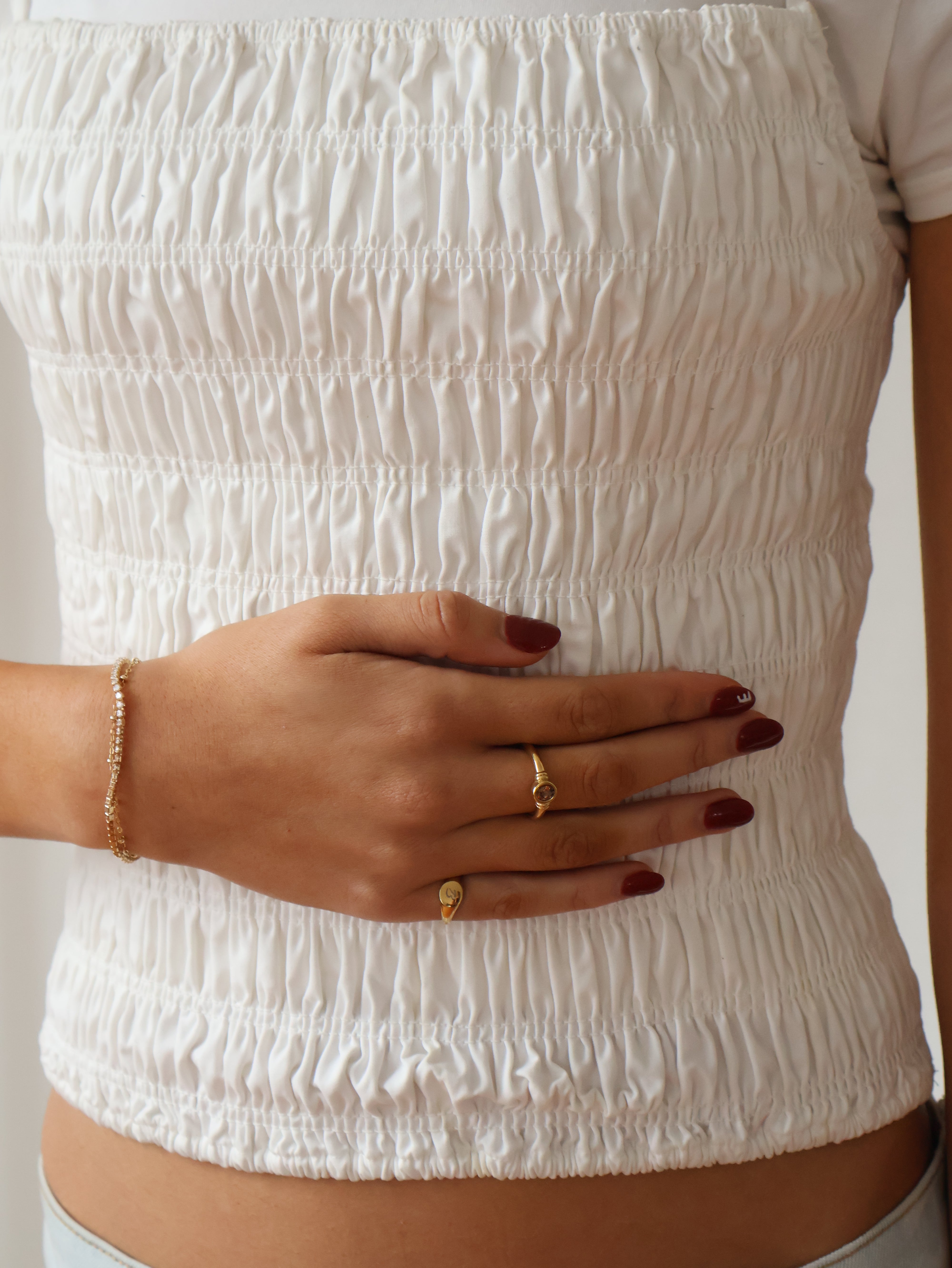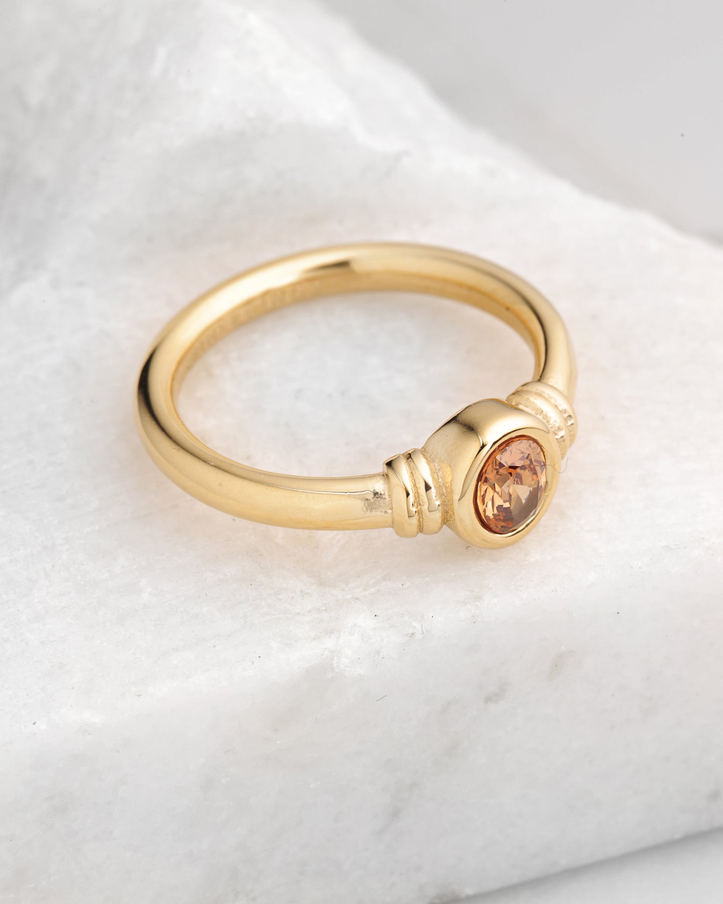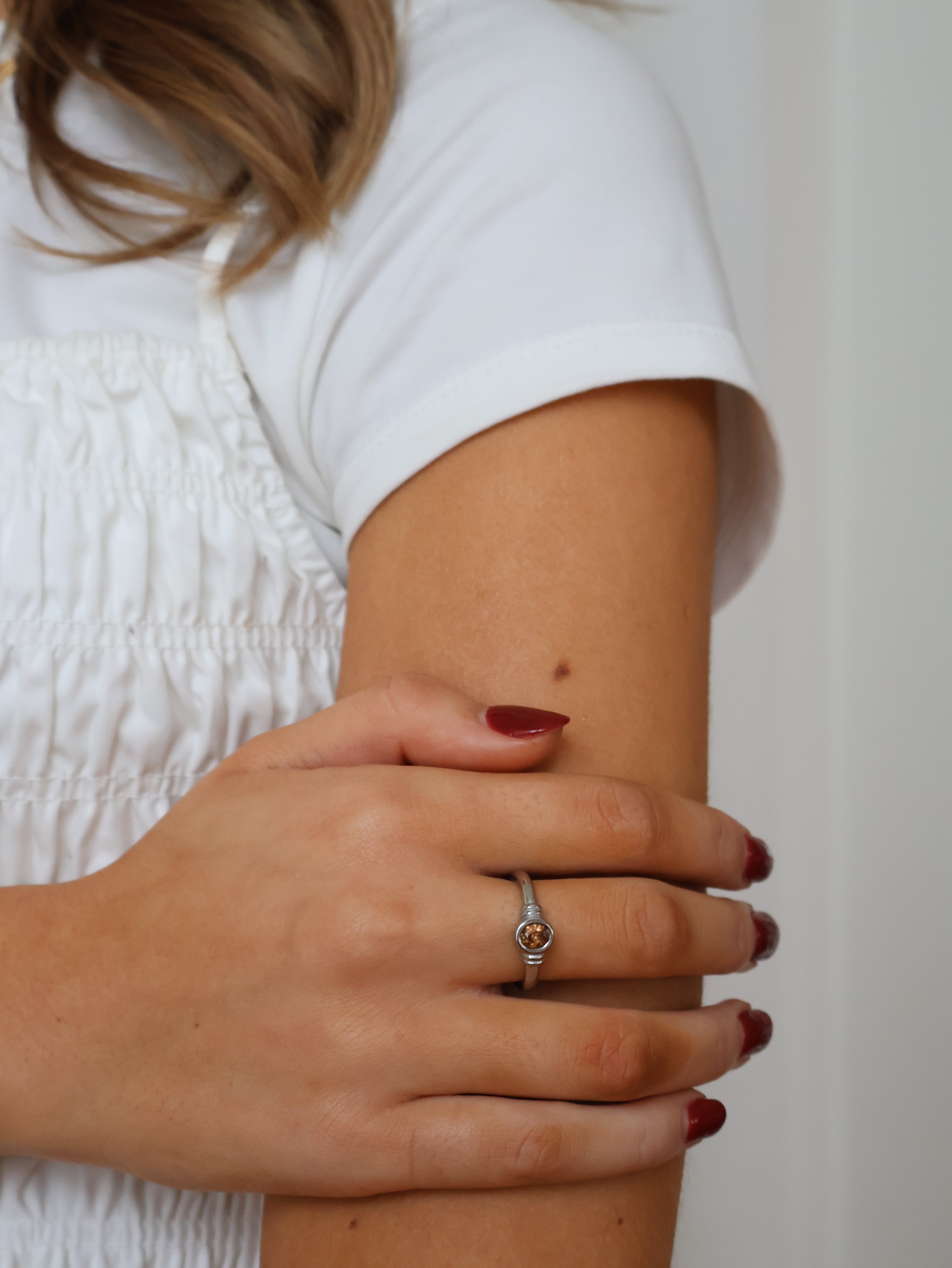 Timeless elegance meets everyday durability in the Florence Ring. Featuring a warm brown gemstone in a classic bezel setting, this piece evokes vintage charm with its subtle engraved detailing. Crafted from tarnish-resistant stainless steel, it’s designed to last-making it the perfect keepsake you'll wear for years to come. Whether stacked or worn solo, the Florence Ring adds a touch of understated luxury to any look.