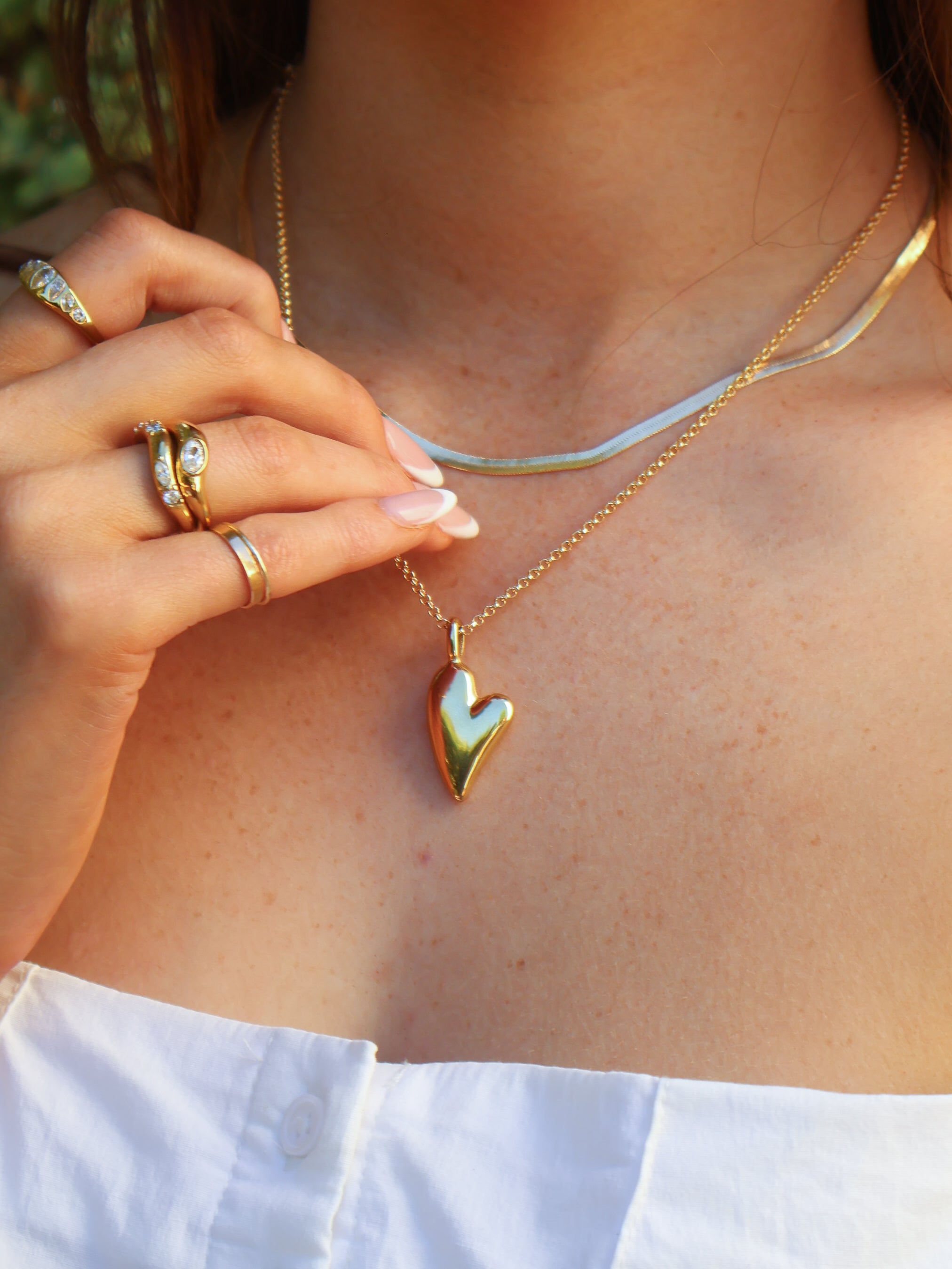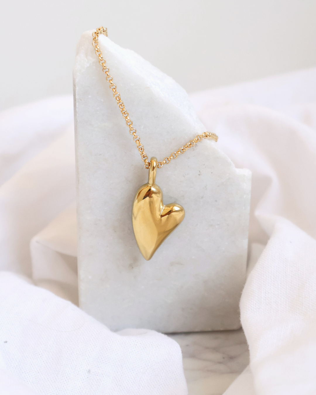 Modern meets feminine, the Vivienne Heart Necklace is handmade with anti-tarnish 14k Gold Filled chain and features a Stainless Steel Gold organic heart charm that beautifully moves along the chain.