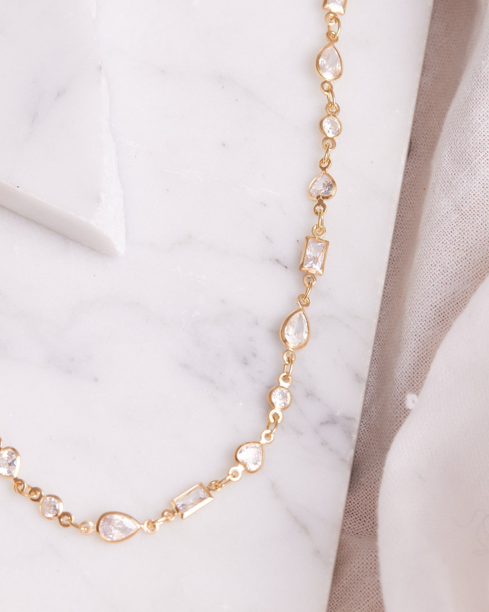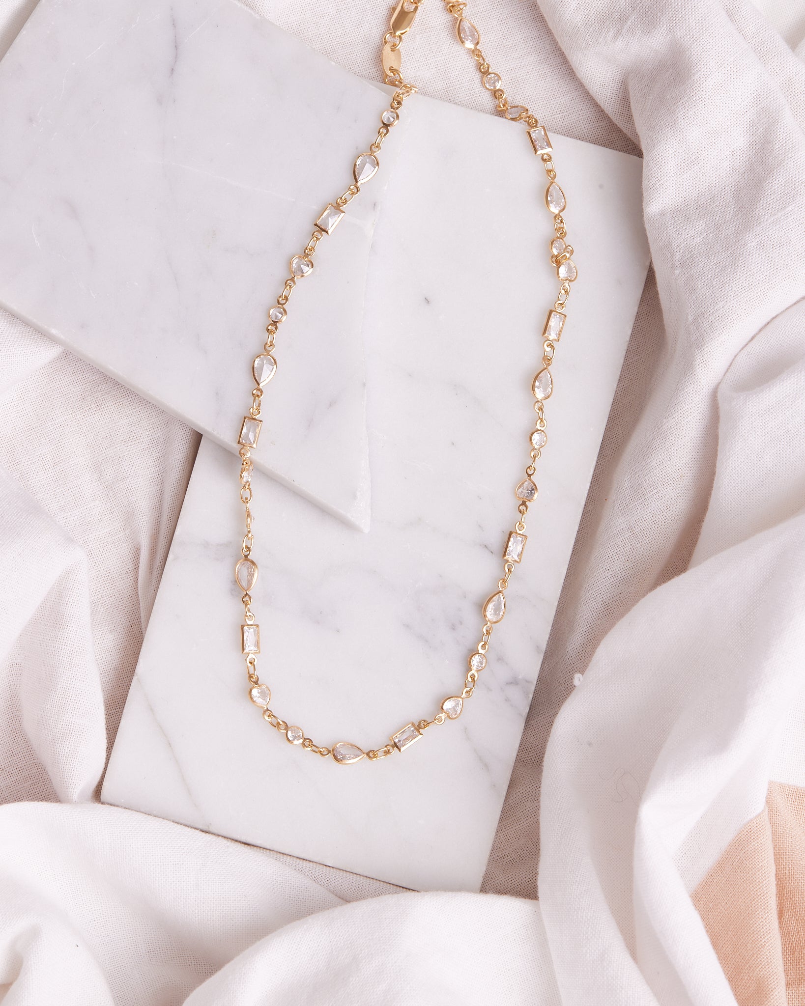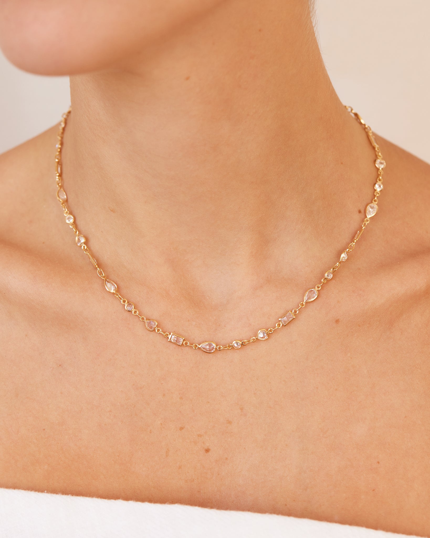 Stunning and elegant, this necklace showcases a cluster of sparkling clear gemstones on a 14k Gold Filled chain - showerproof, hypoallergenic, and perfect for everyday wear.