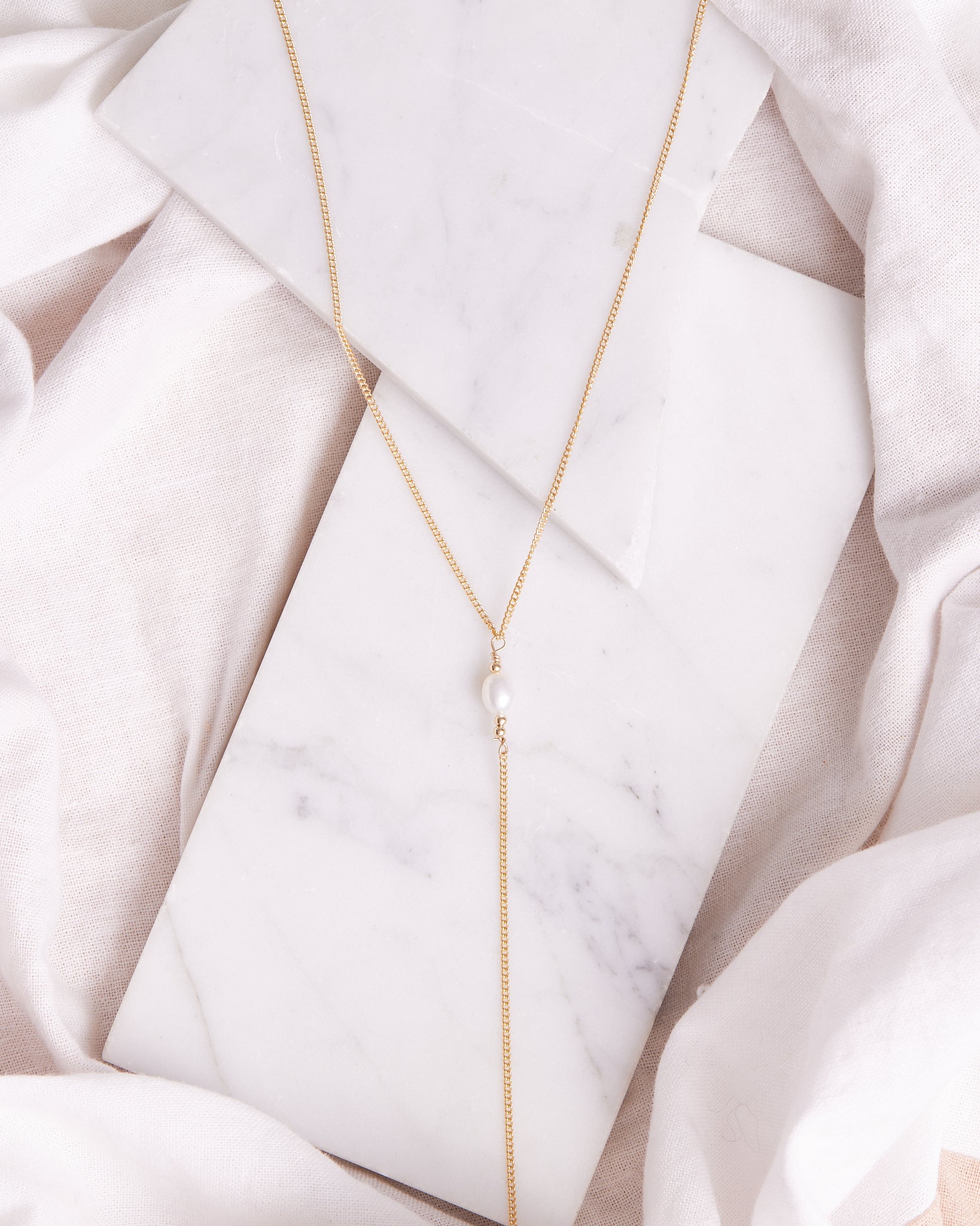 Our beautiful Pearl Drop Necklace features a delicate chain joined by a freshwater pearl.