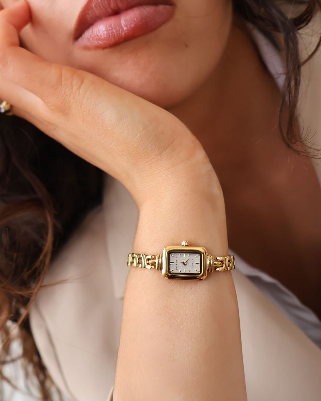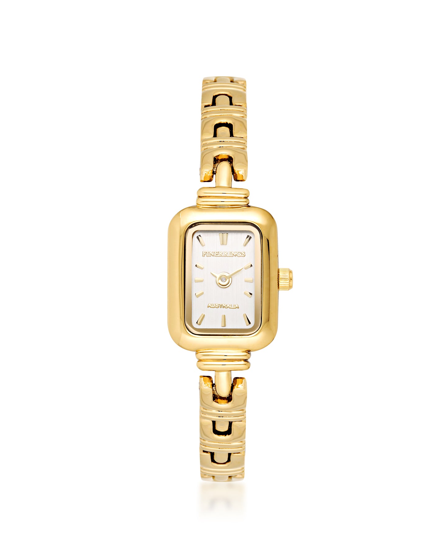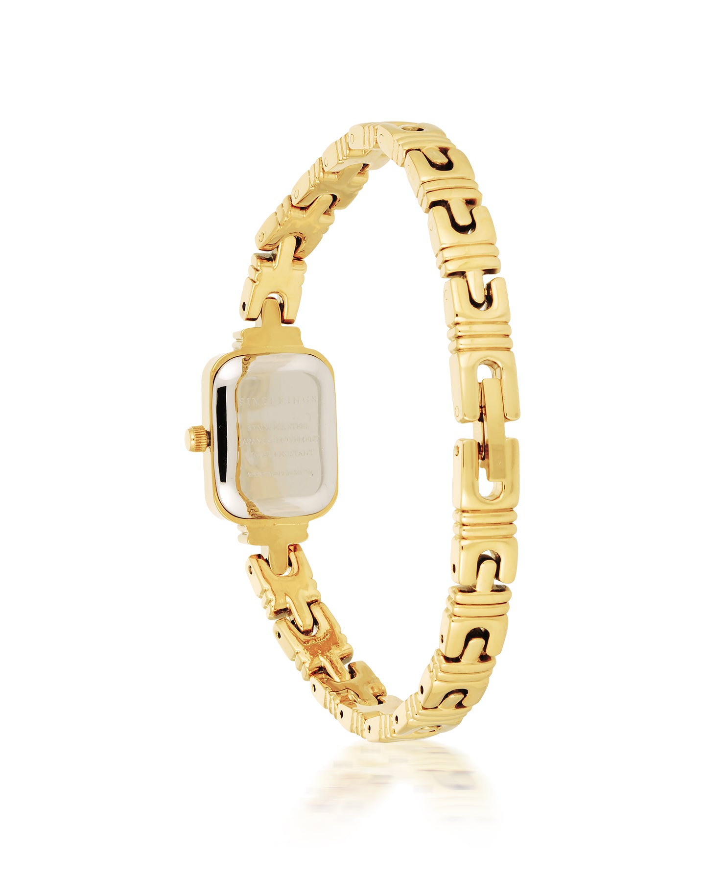 Its petite, 19 x 15mm minimalist face offers a whisper of time elegant and understated, yet full of character. Crafted from stainless steel and finished in luminous 18k gold plating, every detail has been considered to evoke timeless sophistication.