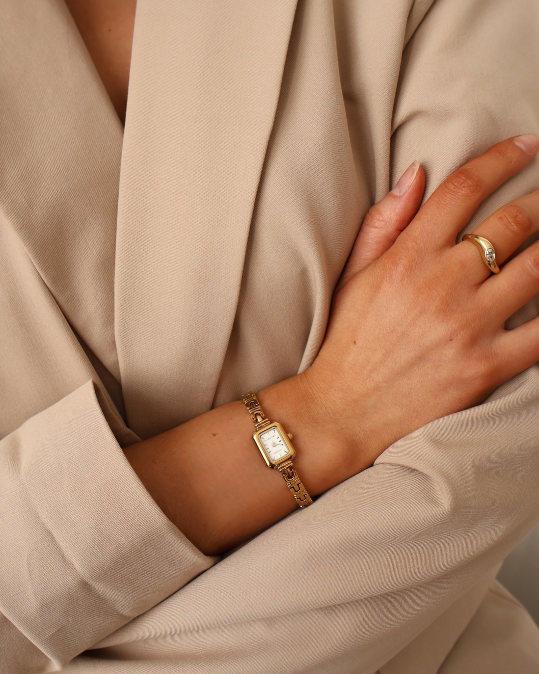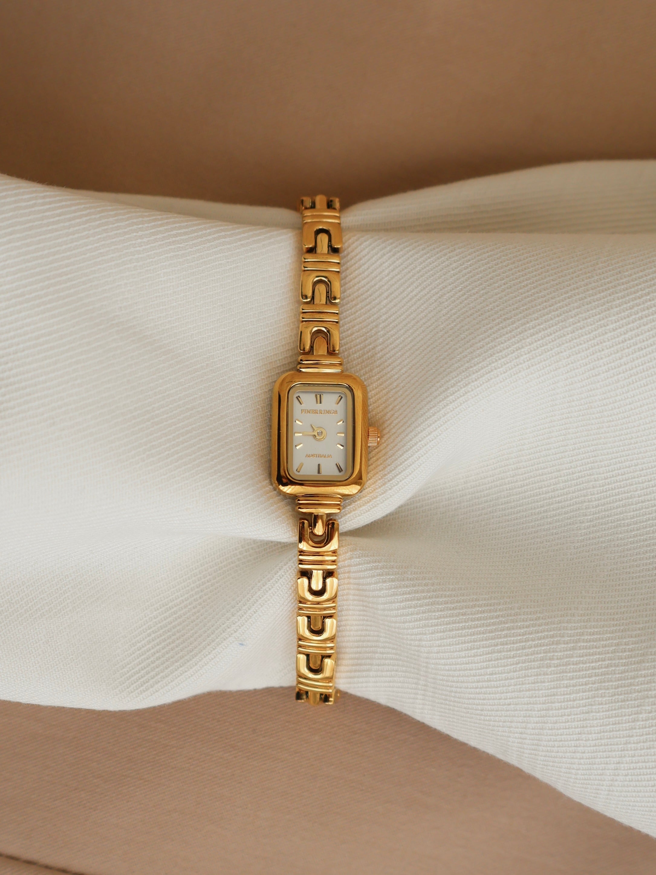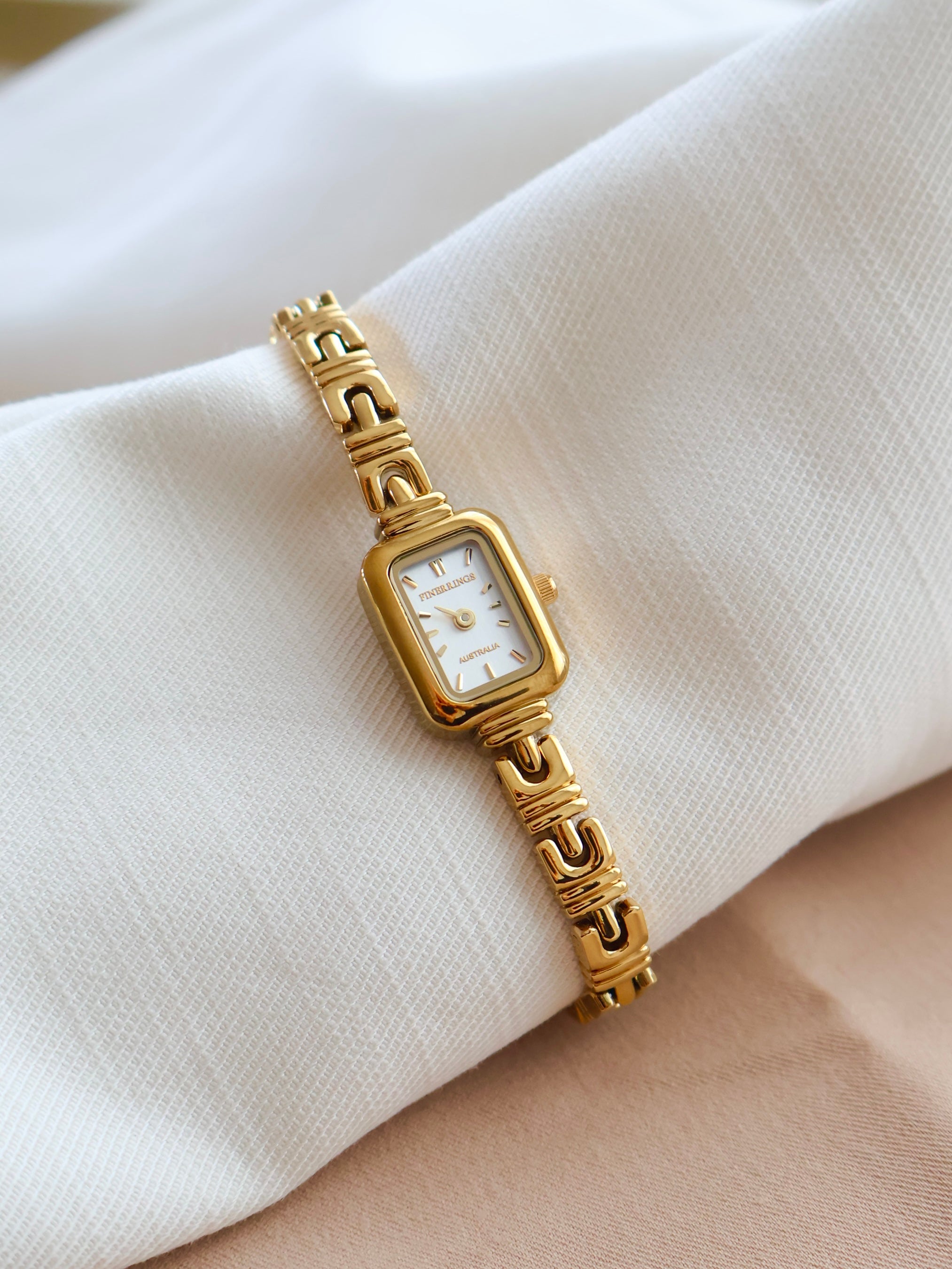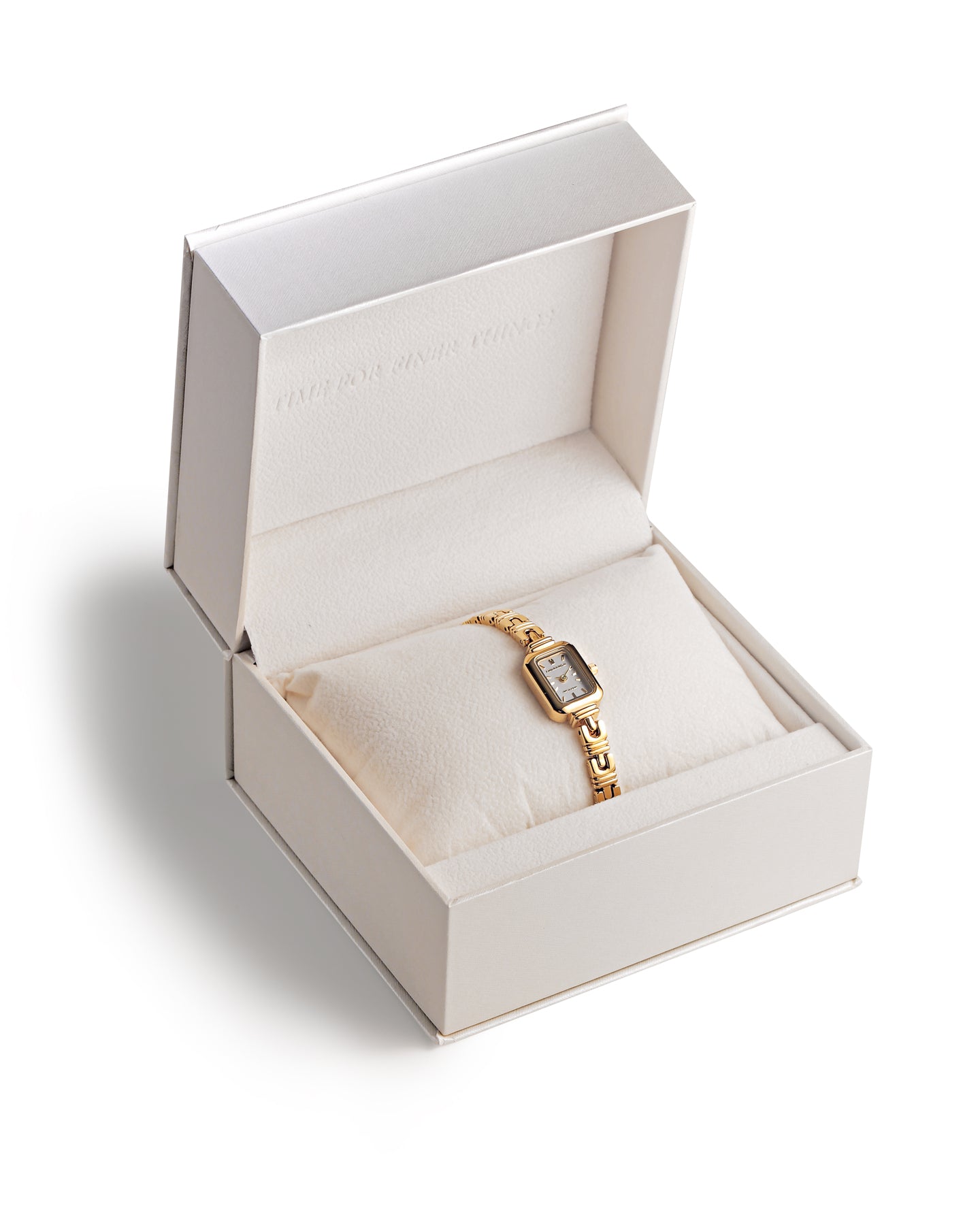 Its petite, 19 x 15mm minimalist face offers a whisper of time elegant and understated, yet full of character. Crafted from stainless steel and finished in luminous 18k gold plating, every detail has been considered to evoke timeless sophistication.