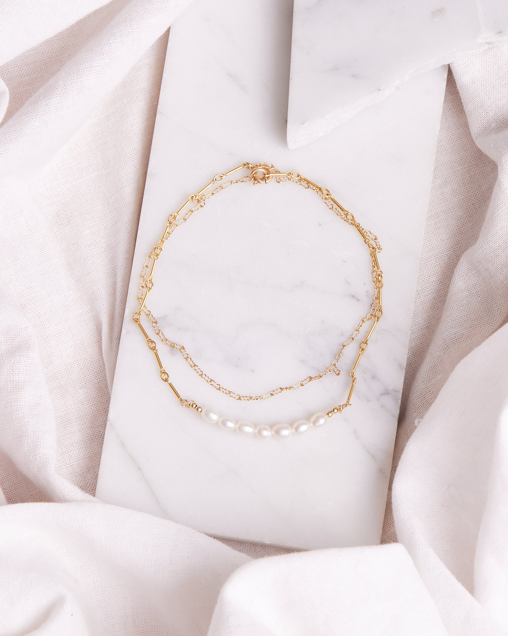 Features two joining crinkled and bar linked chains with stunning freshwater pearls. This comes in 14k Yellow Gold Filled or 925 Sterling Silver