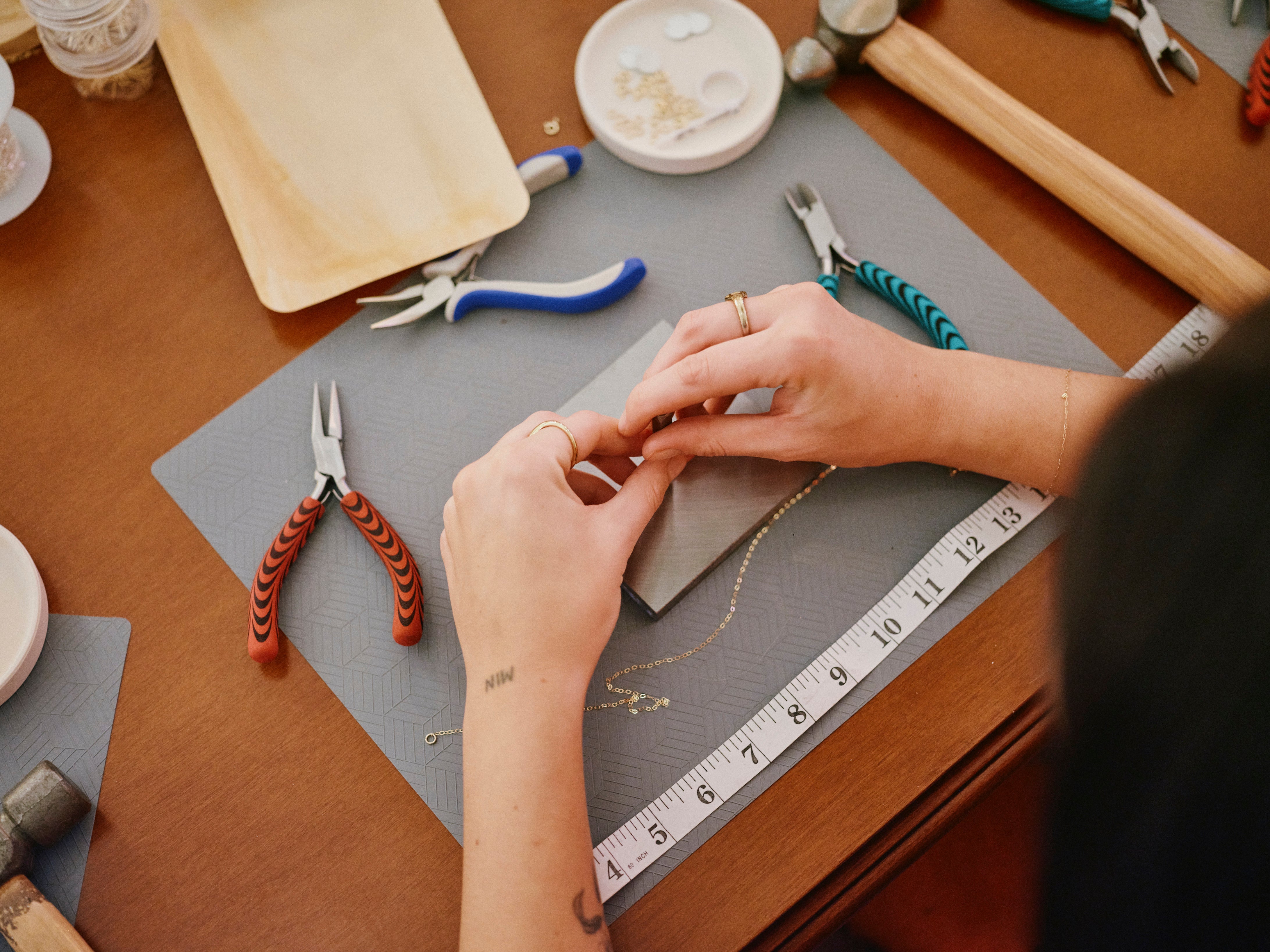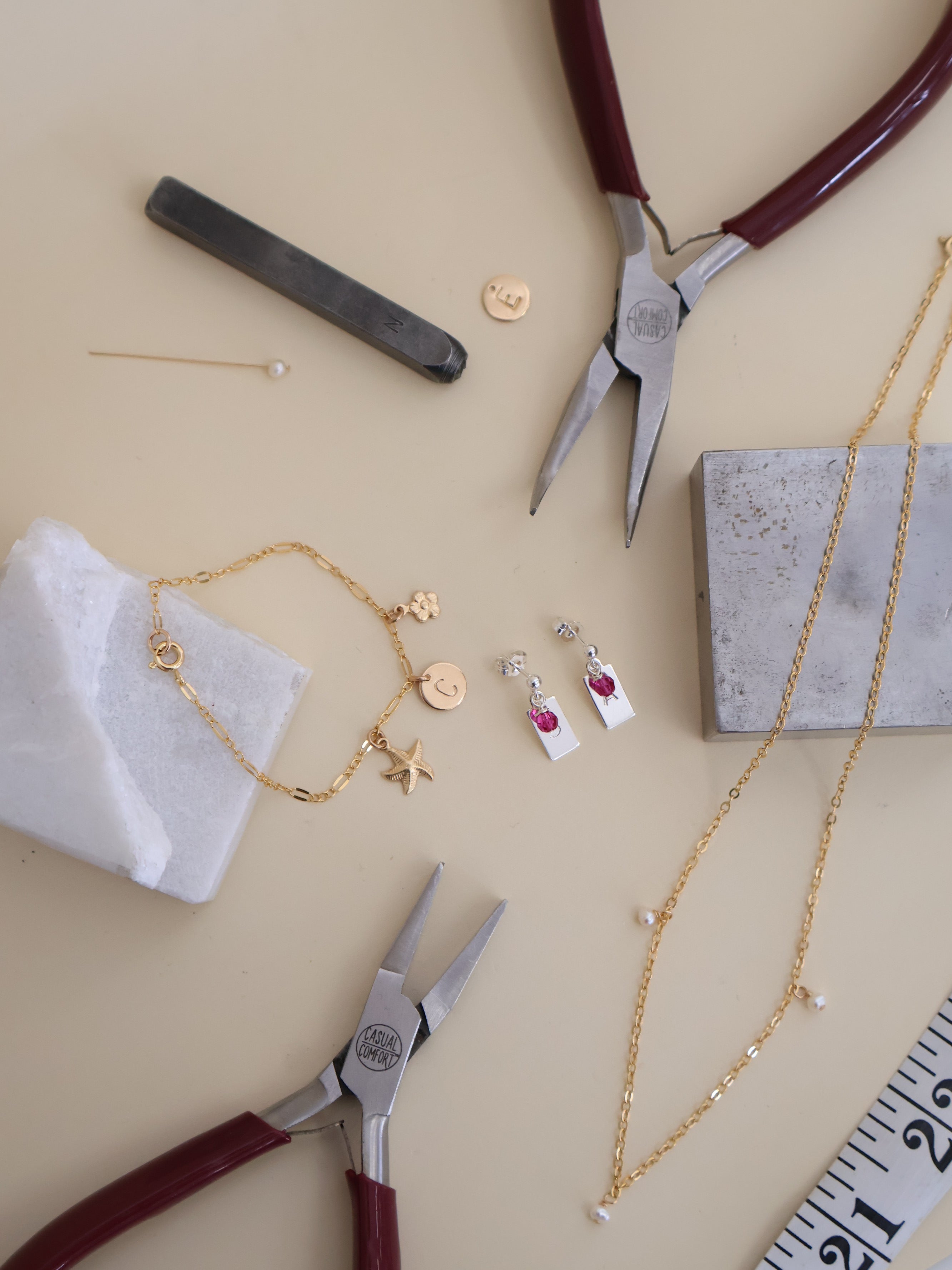 In our Delicates class you'll learn how to hand make from scratch variations of our Custom Charmed Bracelet, Initial Birthstone Studs, The Bella Necklace (See products in the image)